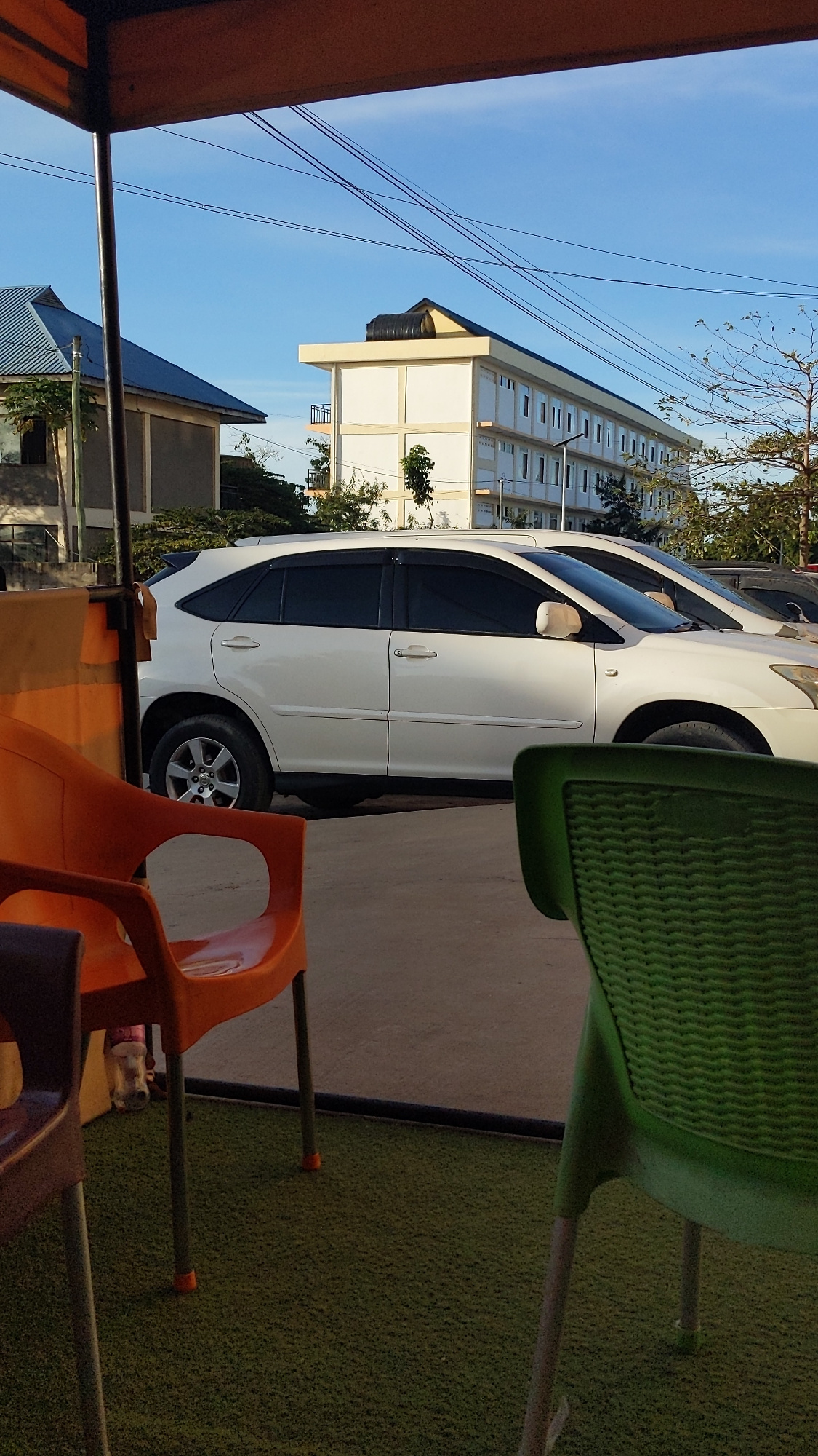 The image shows a street scene in Dar es-Salaam, Tanzania. A white SUV is parked on a paved surface. In the foreground, there are several plastic chairs of various colors (green, orange, and brown). A…read more