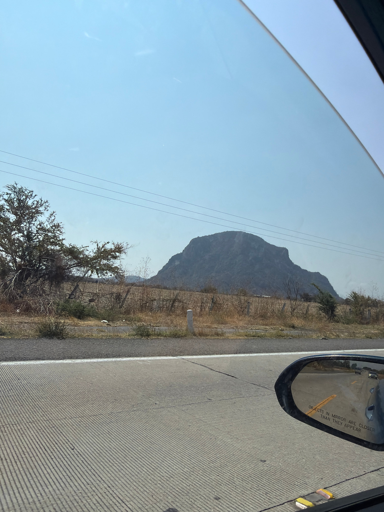 The image, taken from inside a moving vehicle, depicts a view of the landscape outside the passenger window. A large mountain looms in the distance against a light blue sky, with power lines running a…read more