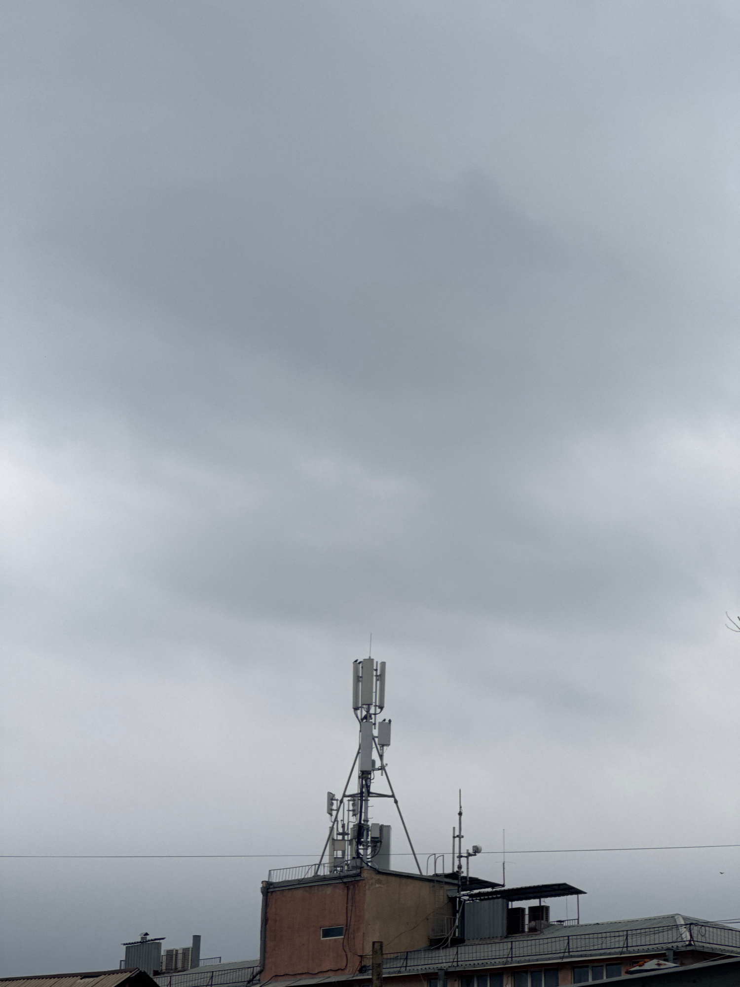 The image, apparently taken in Yerevan, Armenia, shows a view looking up at a cloudy sky, partially obscured by the upper edge of a building. This building is topped with an array of telecommunication…read more