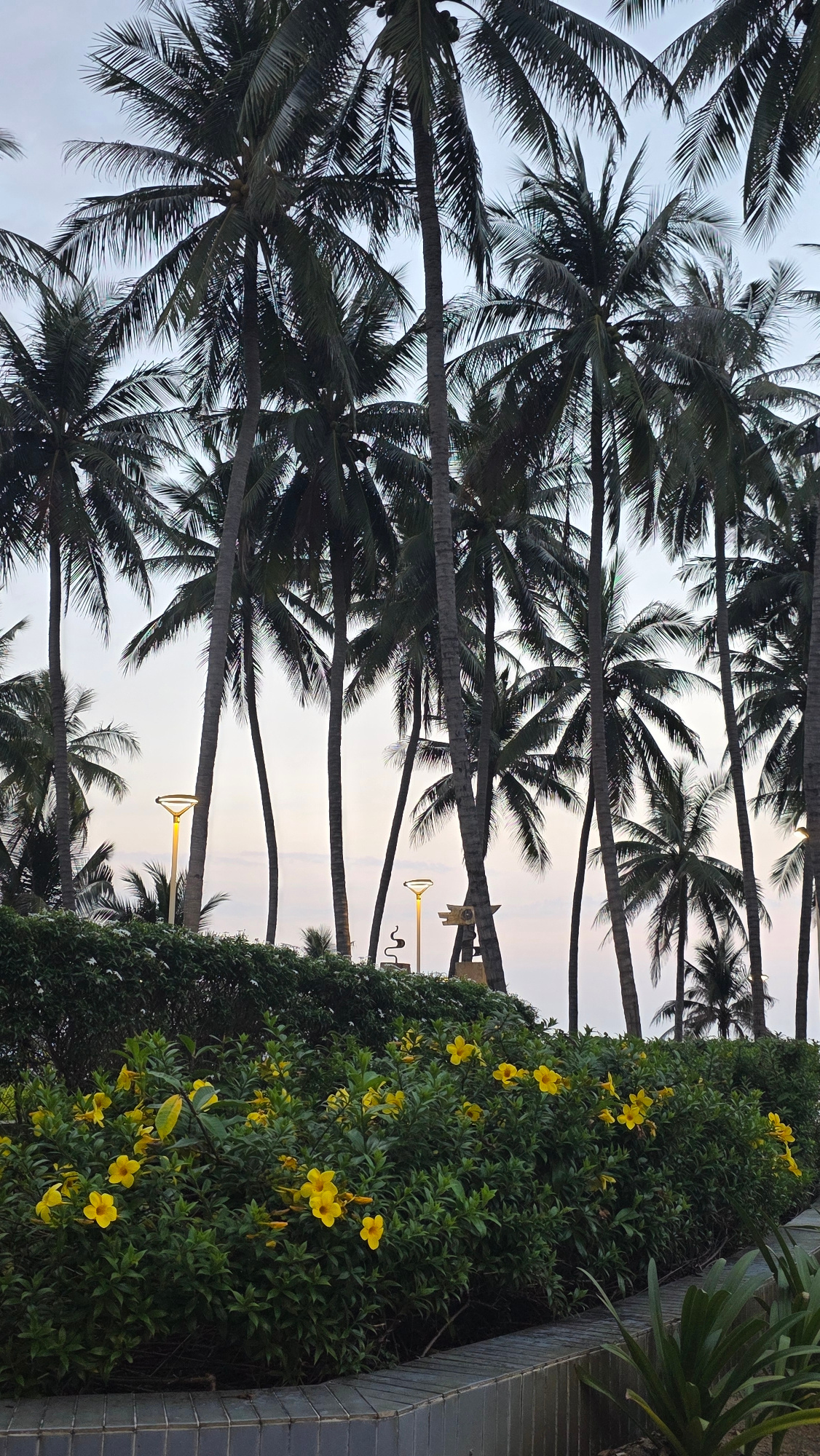 The image depicts a serene tropical landscape, likely captured during dusk or dawn. Numerous tall palm trees with dark, dense fronds and slender trunks dominate the left and center, reaching towards a…read more