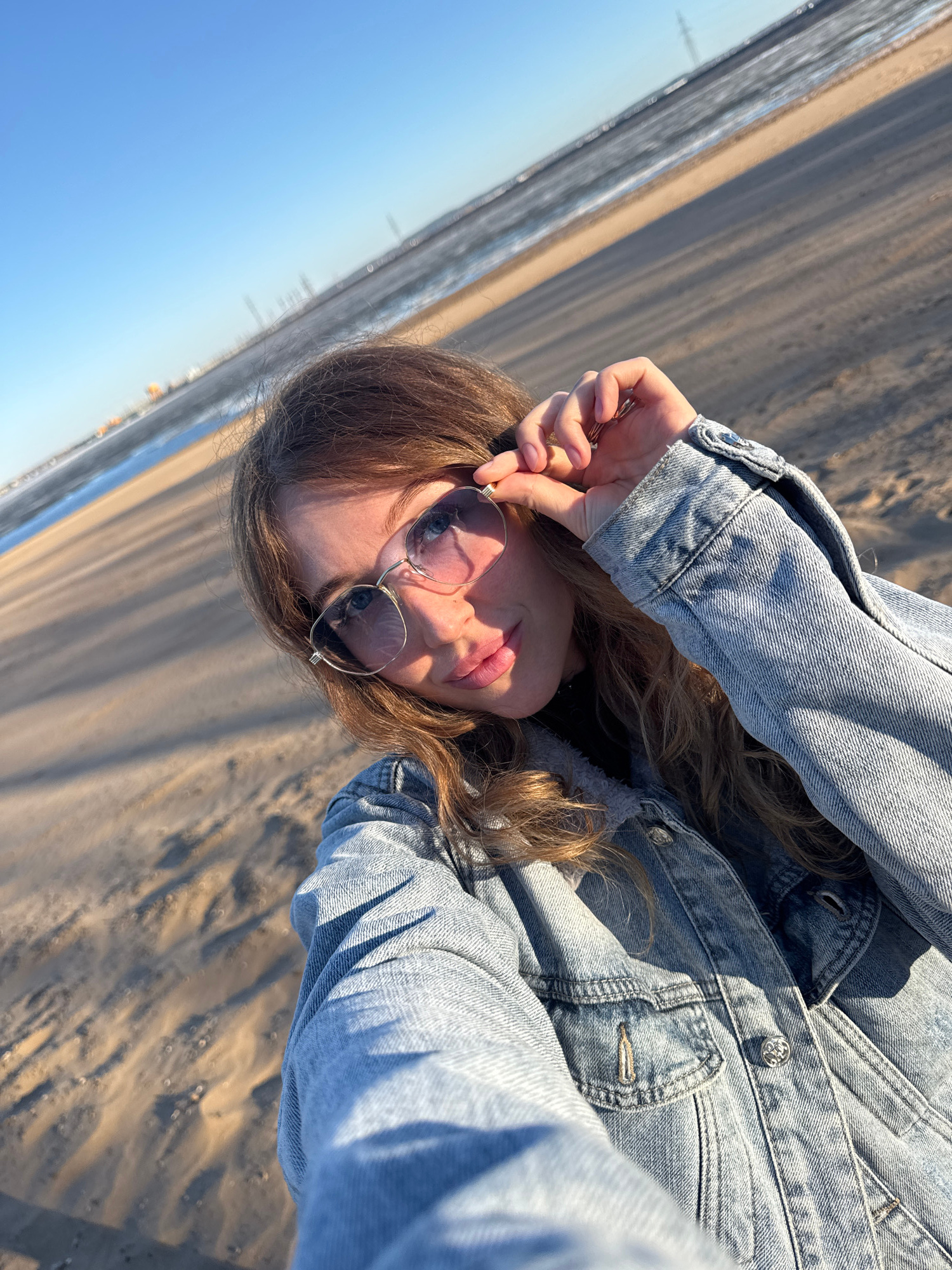 A person wearing sunglasses and a blue denim jacket is lying on a sandy beach, possibly in Noviy, Russia. The background shows a clear blue sky and the sea. The person's head is oriented towards the t…read more