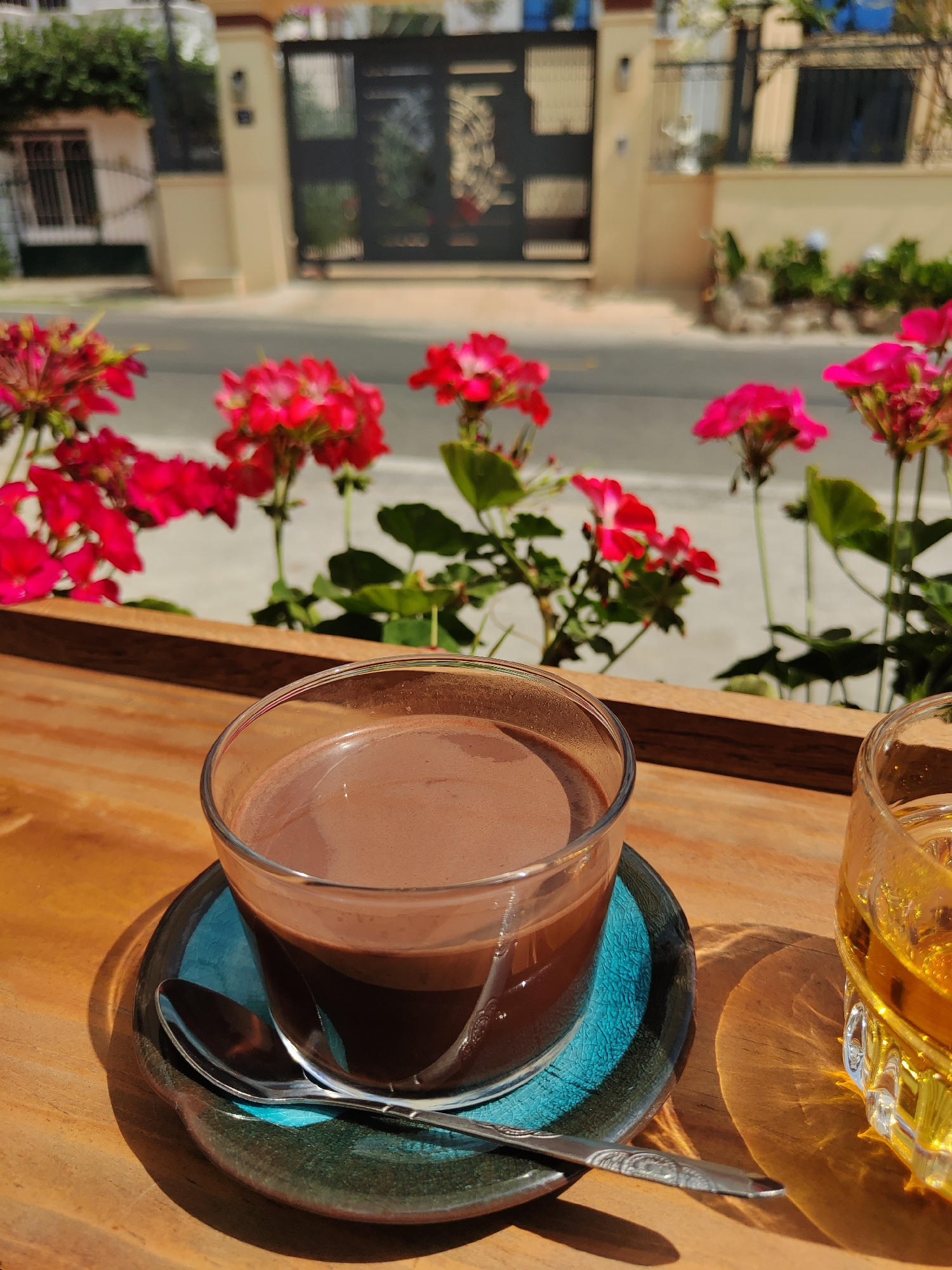 The scene depicts a close-up of a wooden table with two glasses, set against a blurred background. The foreground is dominated by a clear glass filled with a dark brown liquid, likely chocolate milk,…read more