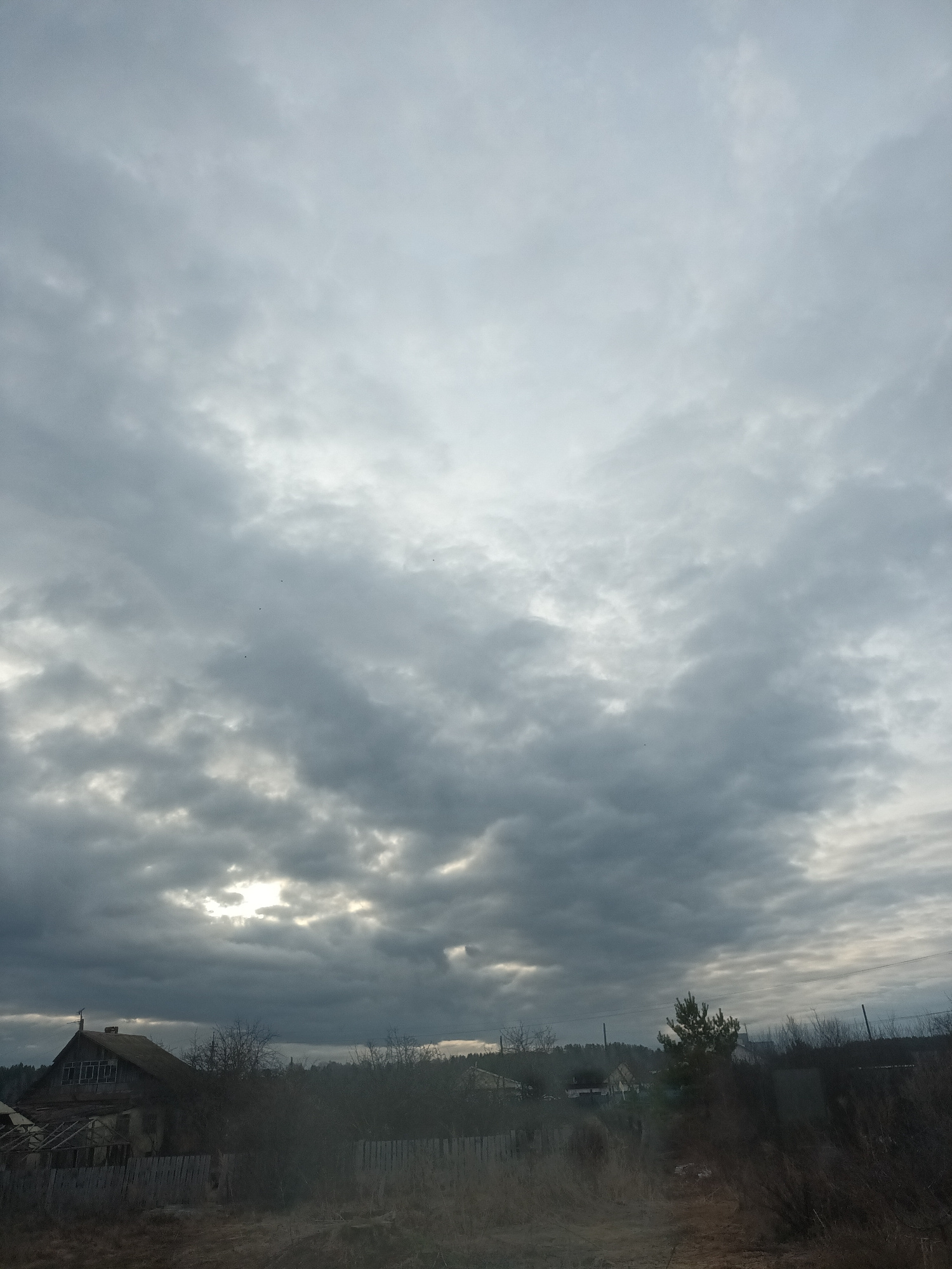 The image displays a rural landscape under a dramatic, overcast sky, likely taken in Olkhovka, Russia. The sky, occupying the upper two-thirds of the frame, is filled with thick, grey clouds, featurin…read more