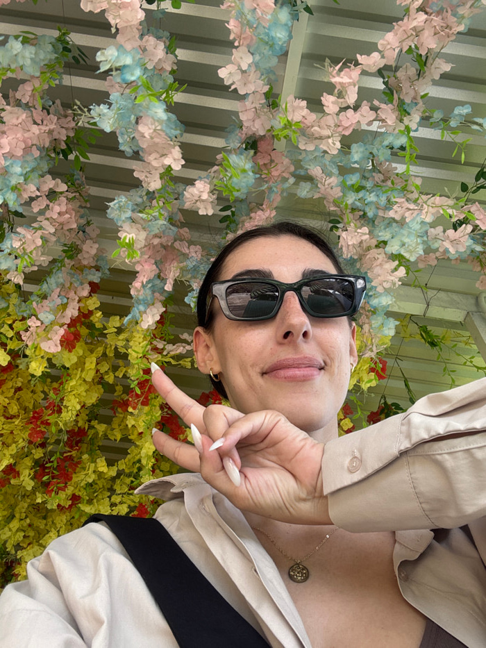 A person with dark hair pulled back, wearing dark sunglasses and a light-colored shirt, poses against a backdrop of flowers. The background features pastel blue and pink blossoms mixed with yellow and…read more