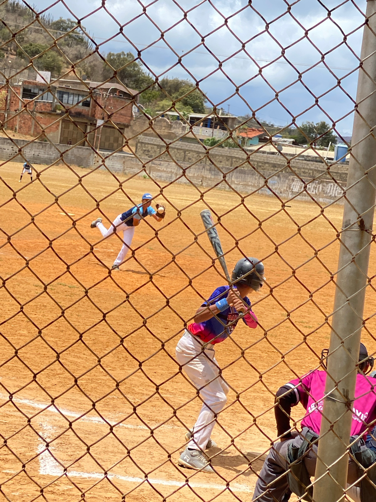 The image captures a baseball game in progress, viewed through a chain-link fence. A batter in a blue and pink uniform swings at a pitch, while a fielder in blue prepares to catch the ball. An umpire…read more