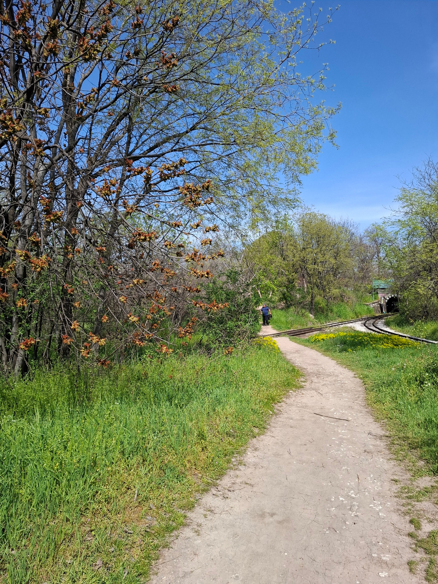 This image captures a serene outdoor scene, likely within a park or natural area in Plovdiv, Bulgaria. The setting features a dirt path running parallel to a miniature railway track, both winding gent…read more