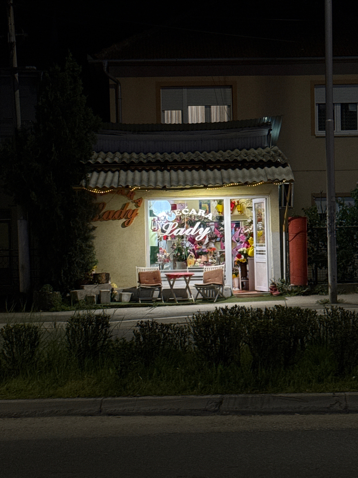 The image shows a brightly lit storefront at night, likely a flower shop, in Kragujevac, Serbia. The time of day is clearly night, with the building's interior and exterior elements illuminated agains…read more