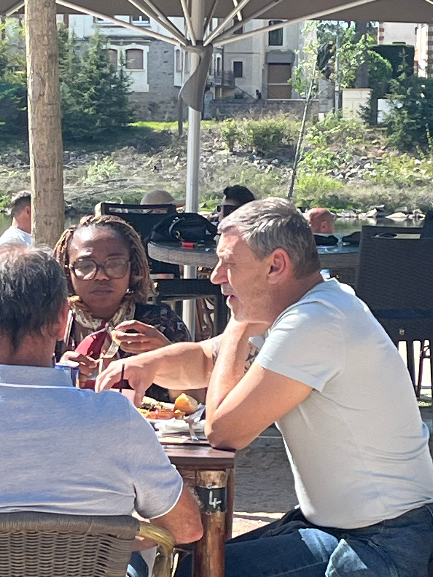 The image shows a group of people at an outdoor table, likely at a restaurant or café. The location is plausibly Saint-Just-Saint-Rambert, France, based on the image content. An umbrella suggests it i…read more