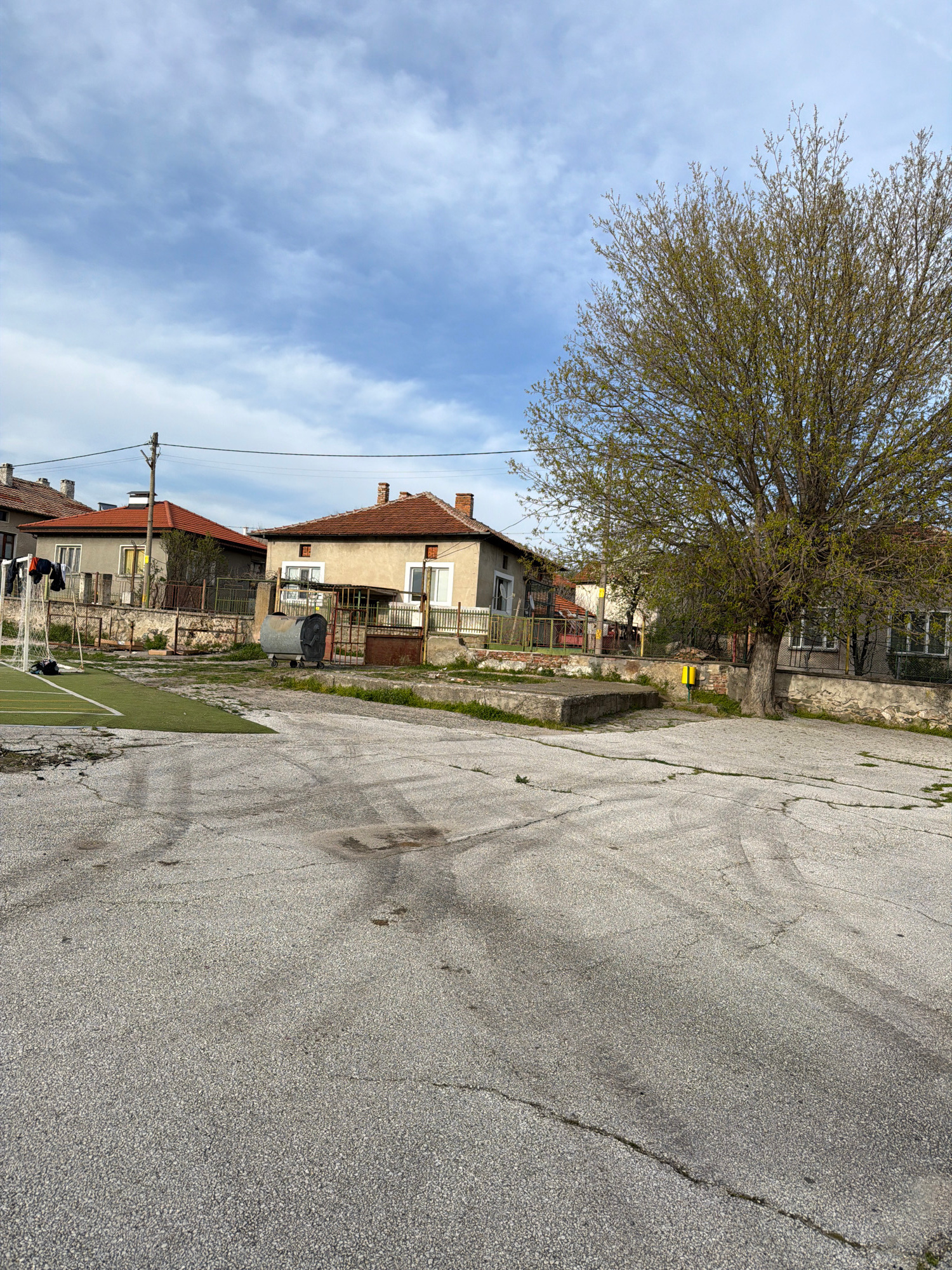 The image shows a street scene in Popintsi, Bulgaria. The street is paved with cracked asphalt. A large tree stands on the left, partially obscuring a building with a red-tiled roof and a balcony. Ano…read more