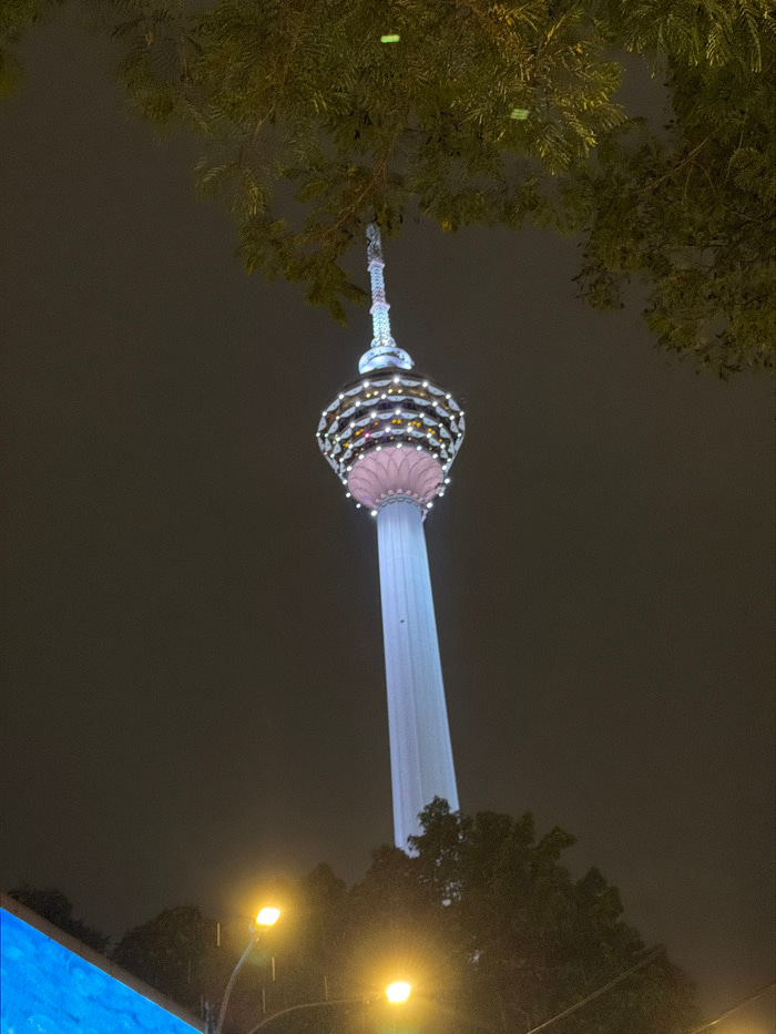 The scene is a low-angle vertical shot of the illuminated KL Tower (Menara Kuala Lumpur) in Kuala Lumpur, Malaysia, at night. The tower's main shaft is lit in white and light blue. The observation dec…read more