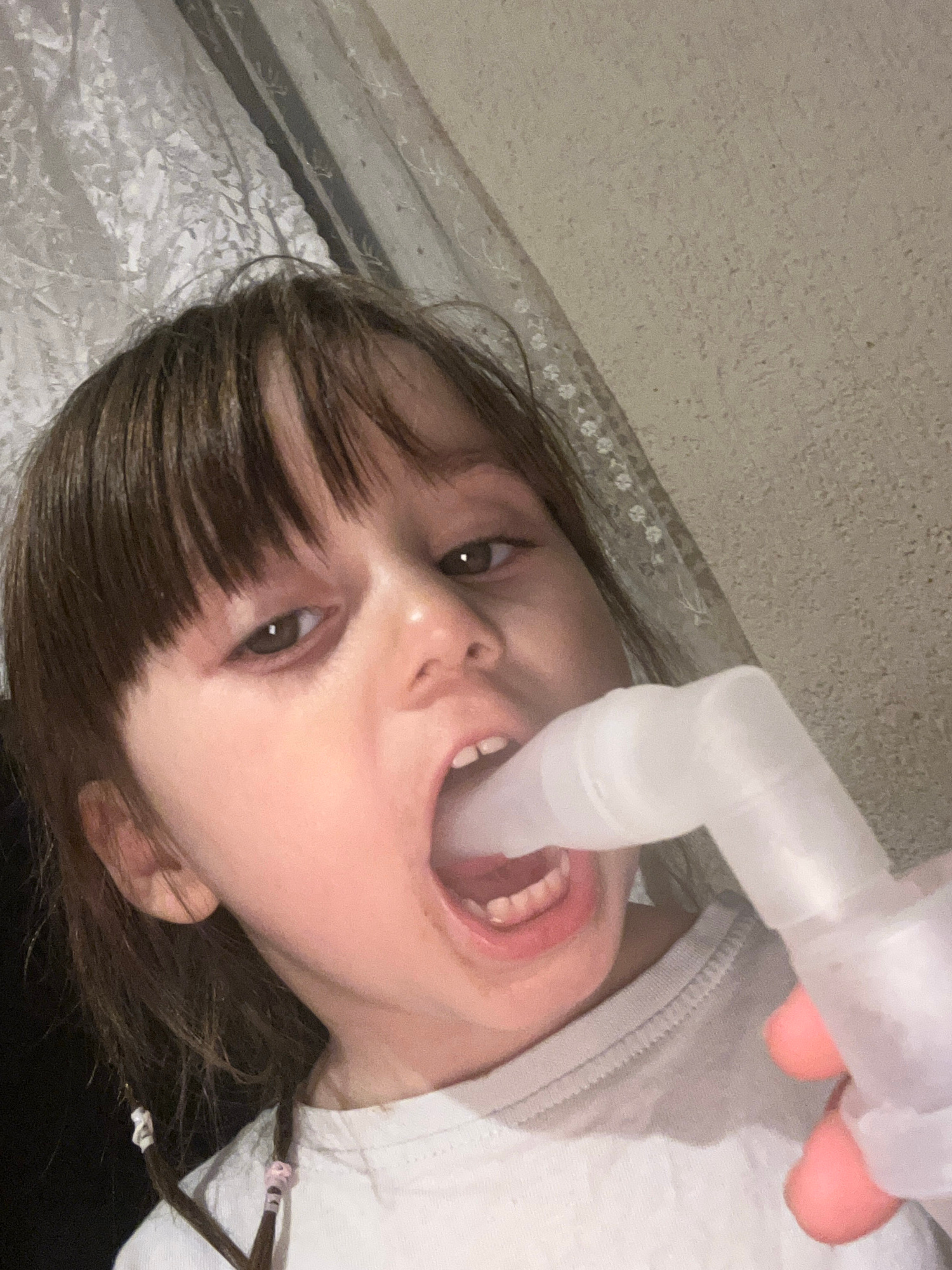 A close-up, slightly angled shot depicts a young girl with brown hair, positioned on a surface with a textured covering, possibly a bed or blanket. She has brown eyes and her mouth is open, with a cle…read more
