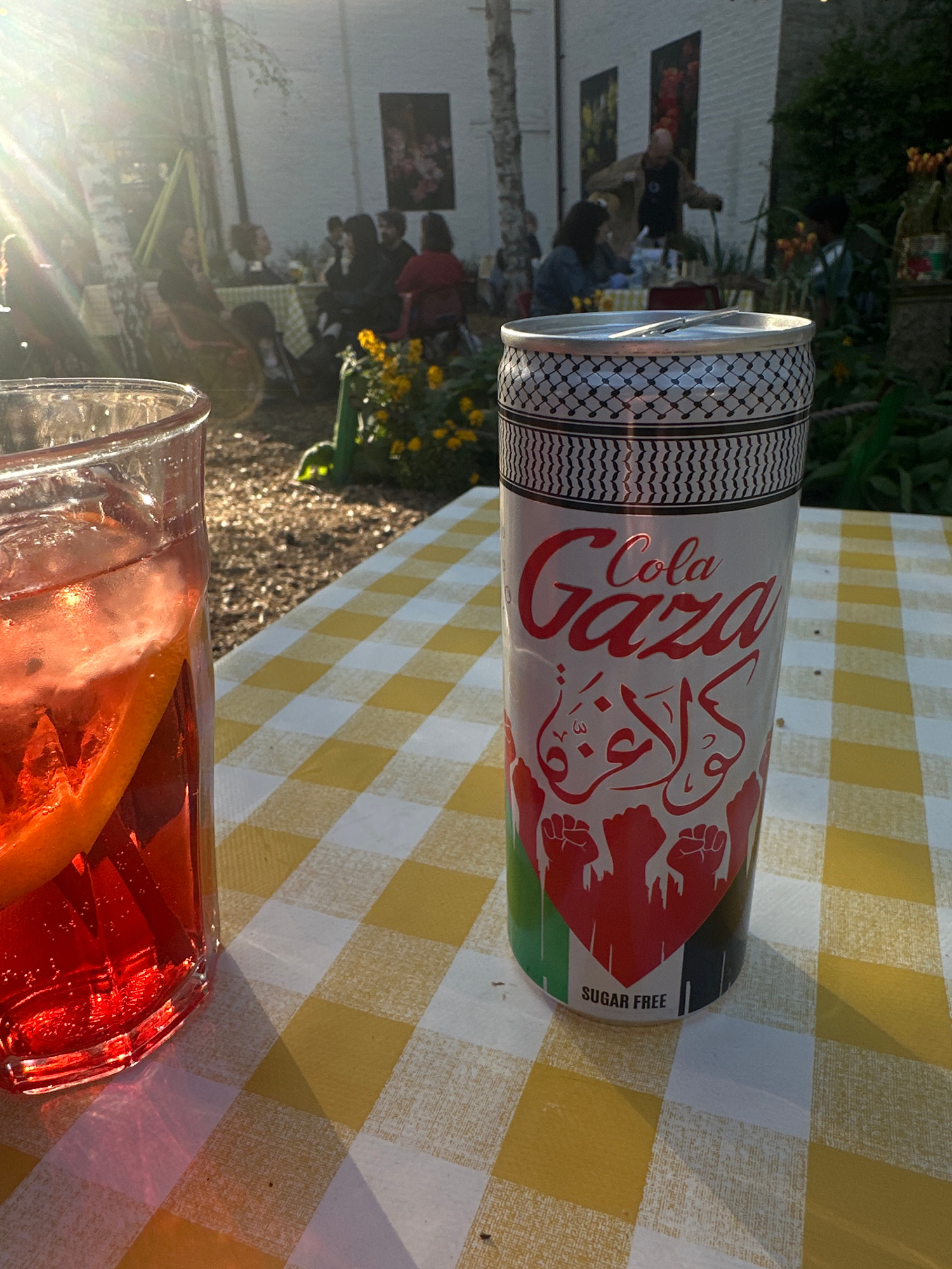 Here's a concise description of the image: The image shows a can of "Cola Gaza Sugar Free" on a yellow and white checkered tablecloth. The can has Arabic writing and images of raised fists, colored i…read more
