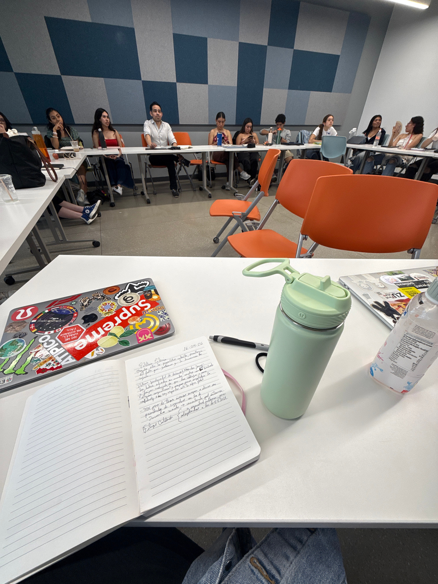 An eye-level shot captures a classroom or lecture hall scene, with the perspective centered on a white table in the foreground. Several students are seated at tables arranged in rows, facing towards t…read more