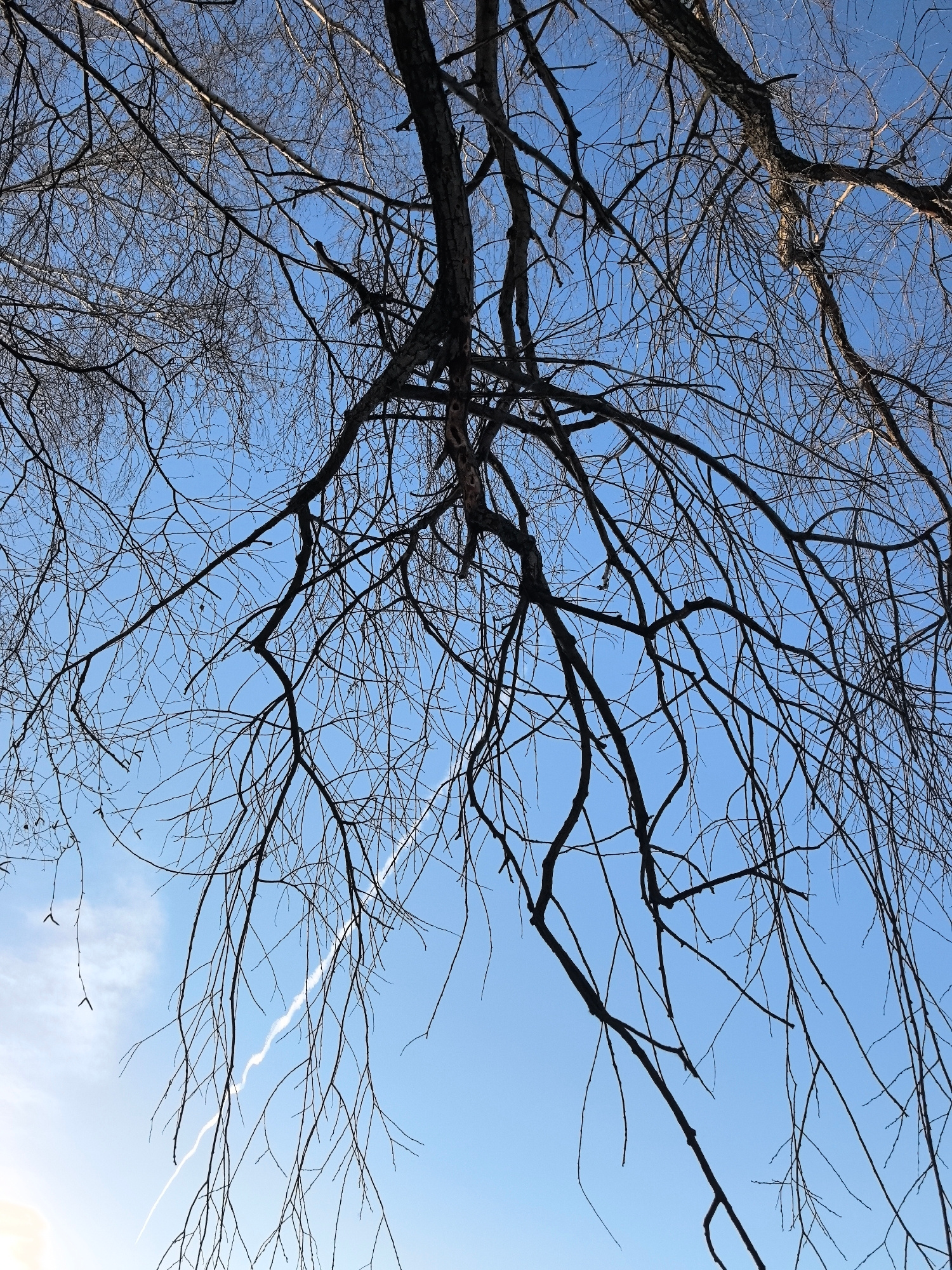 The image shows bare tree branches against a clear, blue sky. A contrail is visible in the lower-left quadrant of the image. The scene appears to be taken outdoors during the daytime. The location is…read more