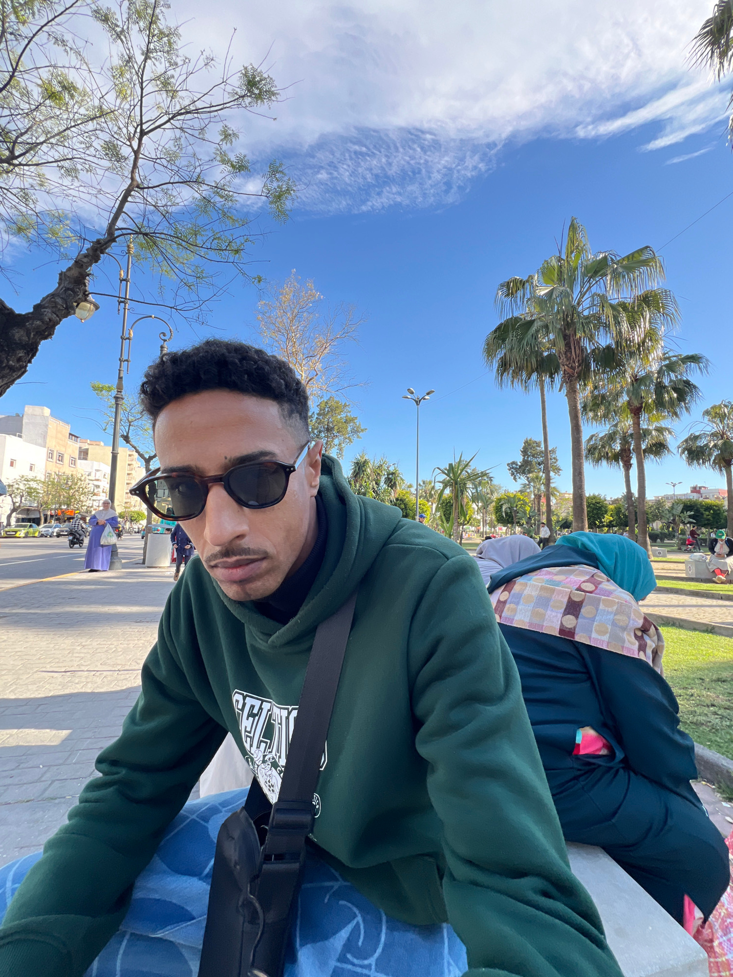 A medium shot of a person in sunglasses and a green hooded sweatshirt, possibly taking a selfie, with the city of Tangier, Morocco, in the background. In the background are palm trees, people sittingβ¦read more