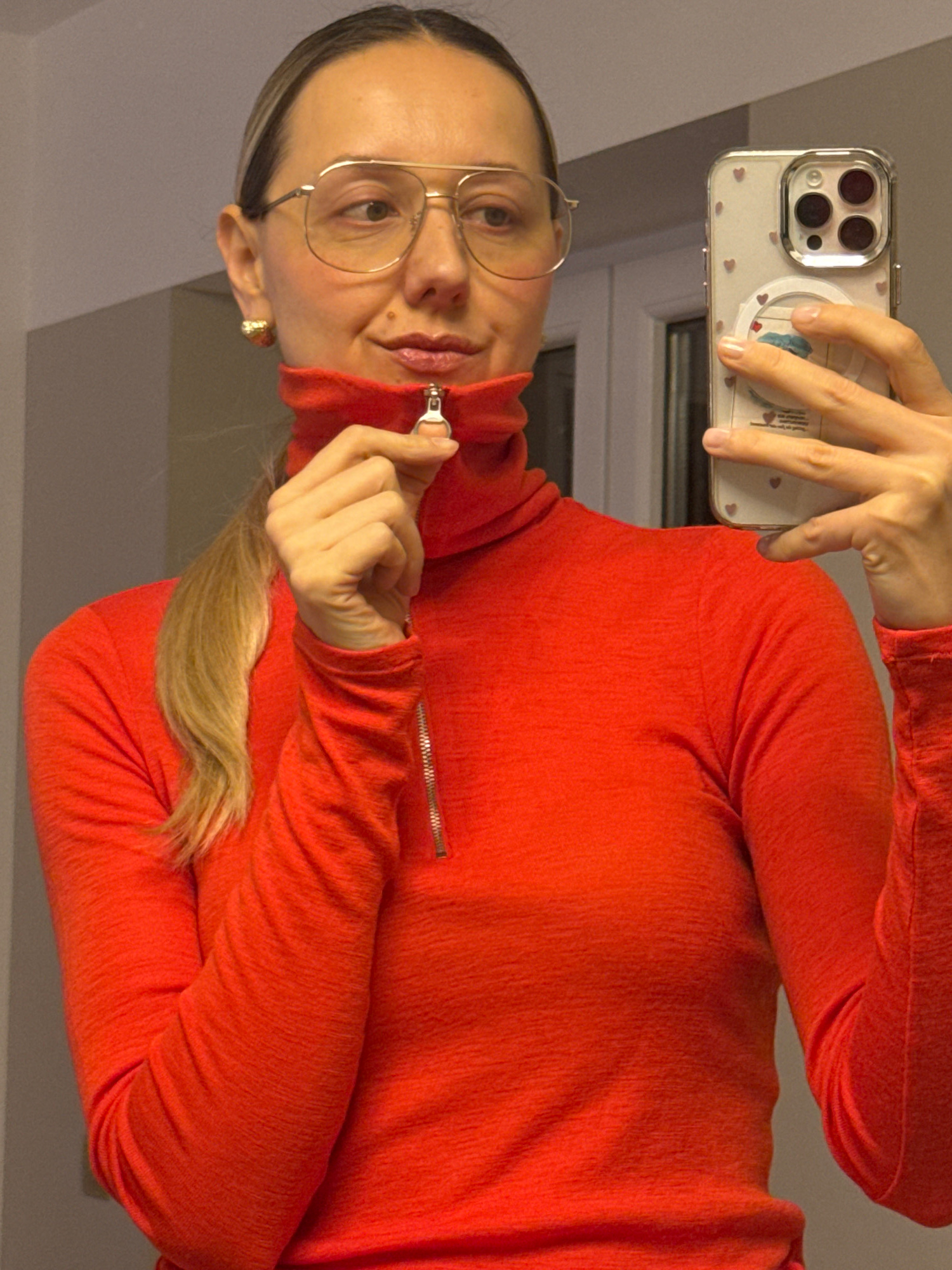 A female individual is depicted in a mirror selfie, partially visible from the chest up within an indoor setting. She has blonde hair pulled back, fair skin, and is wearing aviator-style glasses with…read more