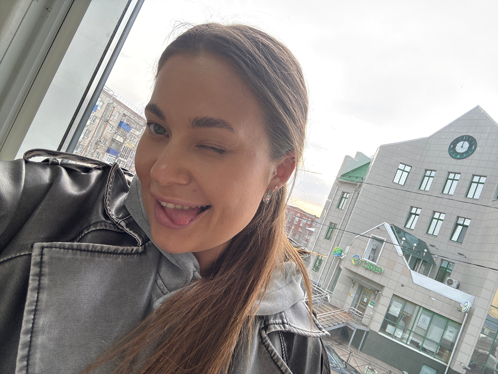 A woman is pictured indoors, facing the camera with a playful wink and her tongue slightly extended. She is wearing a gray jacket over a gray hoodie, and her long brown hair falls to the side. Outside…read more