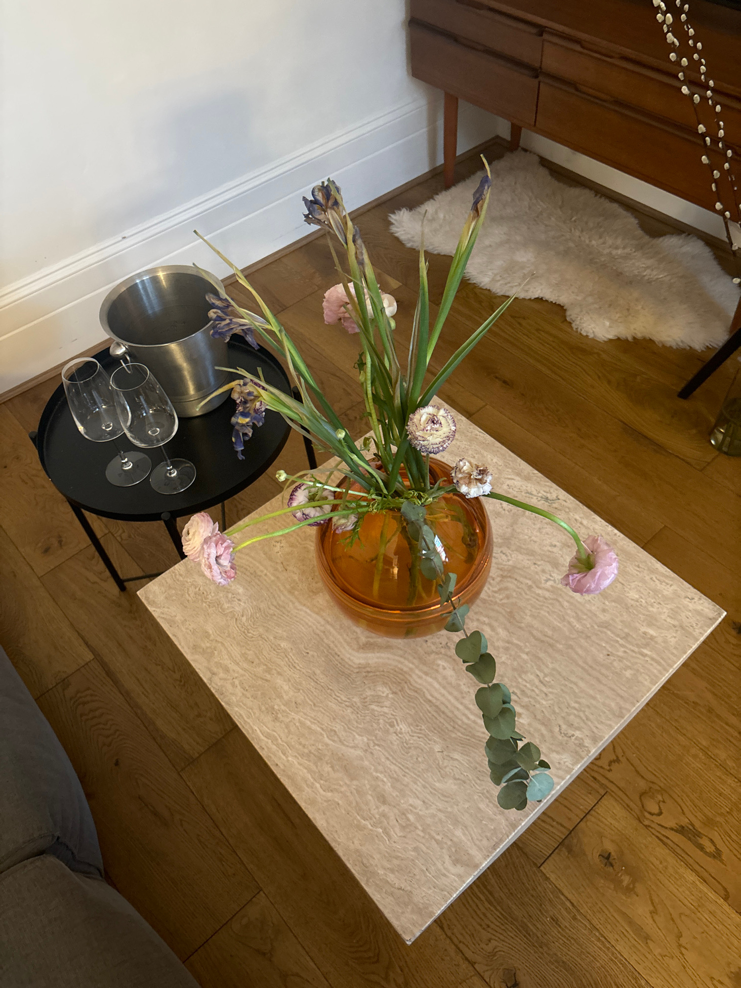 This is an indoor scene featuring a vase of flowers arranged on a square, light-colored coffee table. The table is positioned on a wooden floor. The arrangement includes ranunculus and eucalyptus. Nexβ¦read more