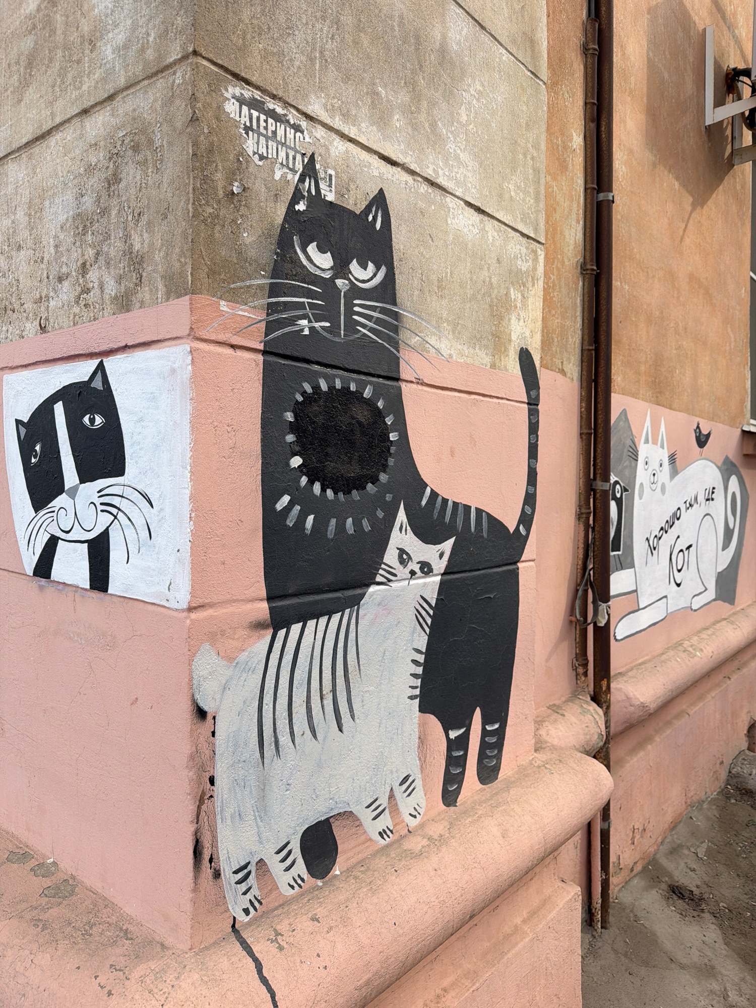 The image shows a staircase in Votkinsk, Russia, decorated with cat-themed artwork. The staircase is painted pink and has several sections featuring different cat designs in black, white, and gray. Th…read more