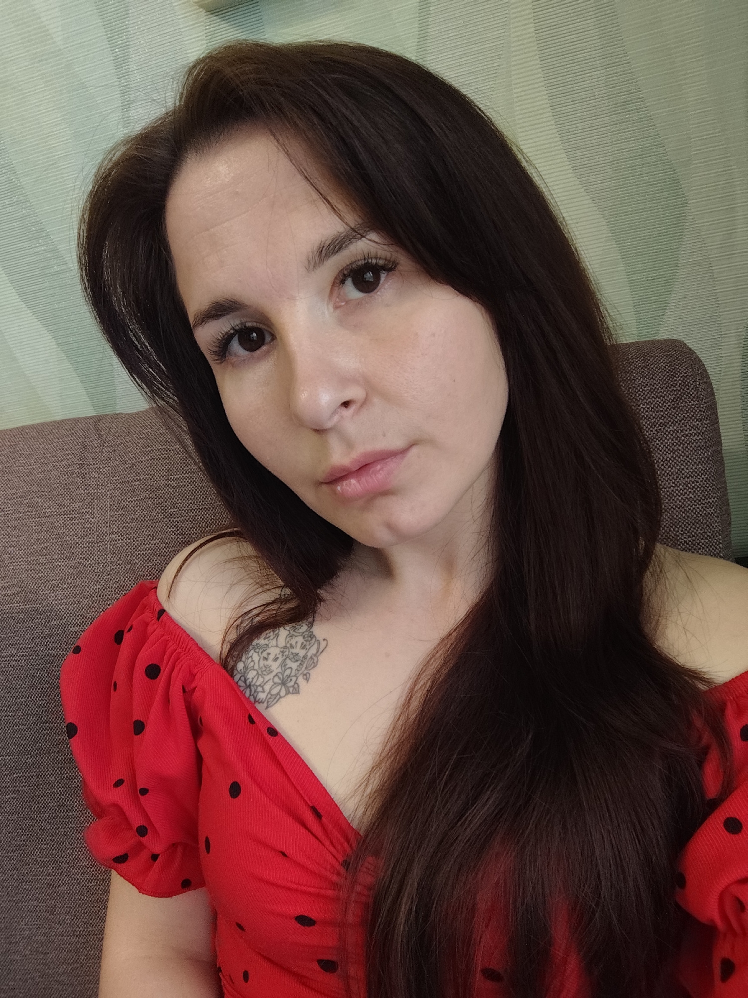 A young woman with long, dark brown hair is captured in a headshot-style portrait, looking directly into the camera. Her expression is neutral, with her lips slightly parted in a soft pout. She is wea…read more