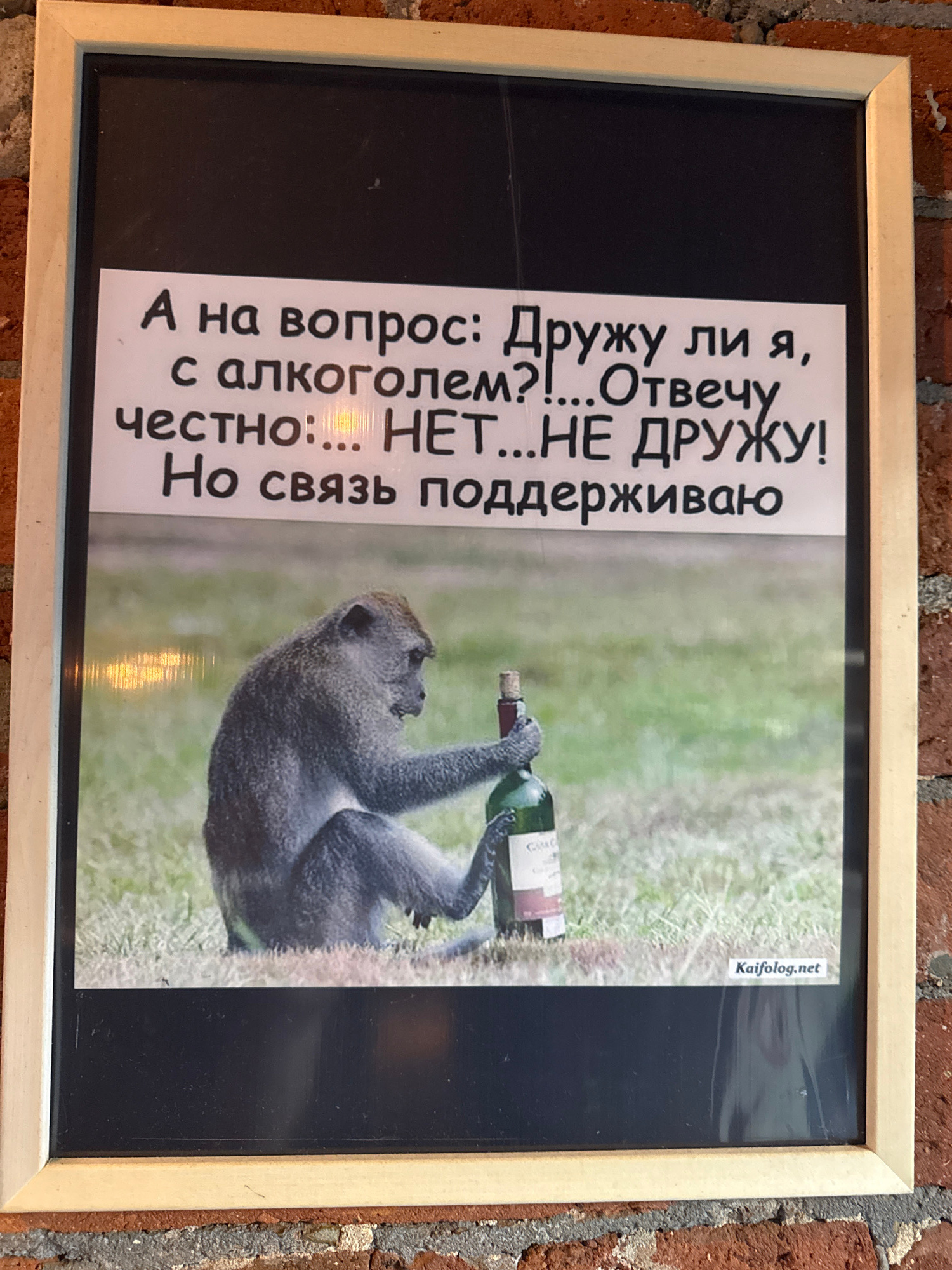 A framed photograph hangs on a brick wall. The photo depicts a monkey lying on grass and holding a green wine bottle with the cork removed. To the left of the monkey is a block of text in Russian whicβ¦read more