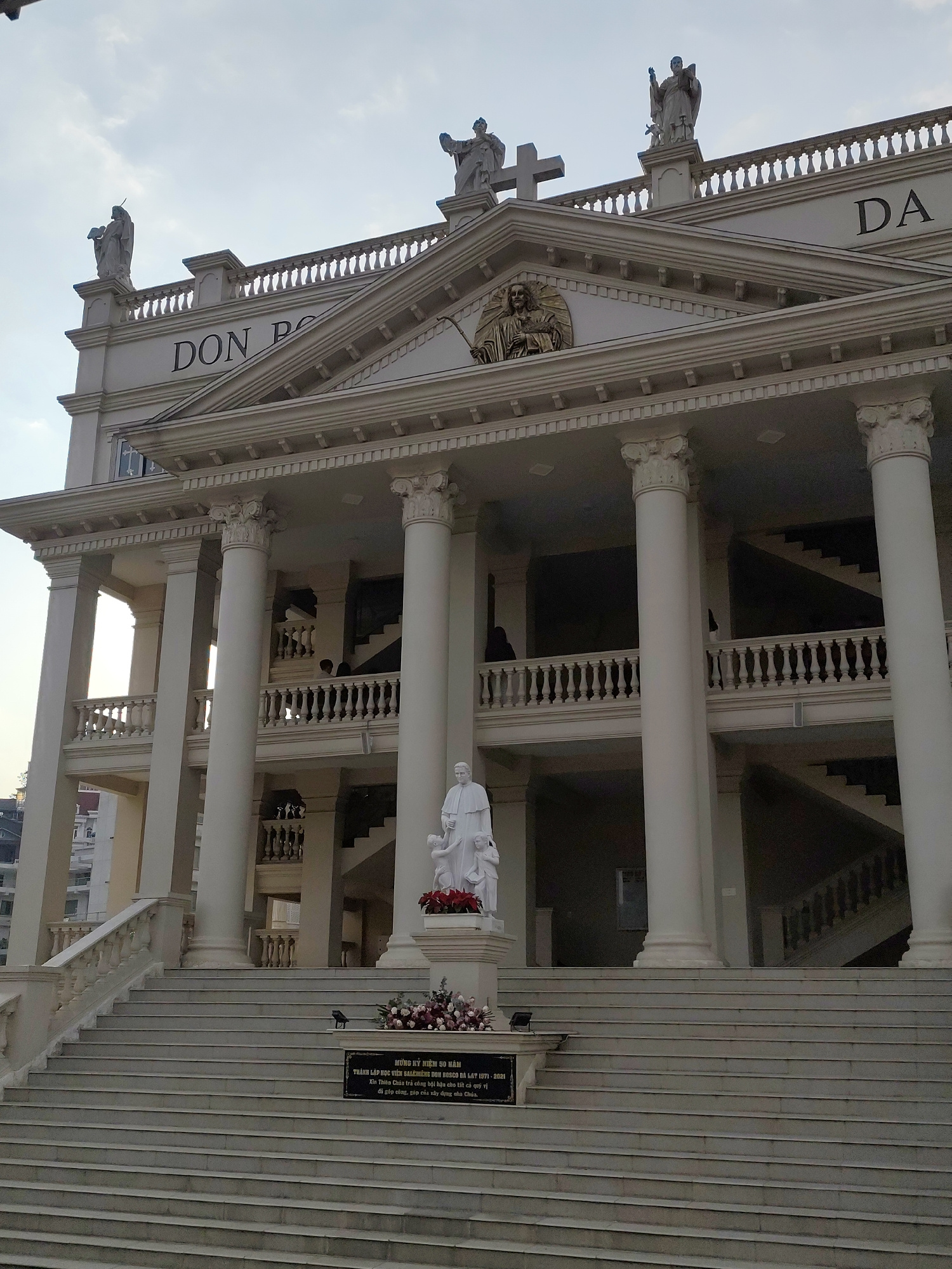 This image shows the Don Bosco School in Da Lat, Vietnam. The facade of the building is white with tall columns and balustrades. At the top, the name "DON PO" is visible on the left and "DA" on the ri…read more