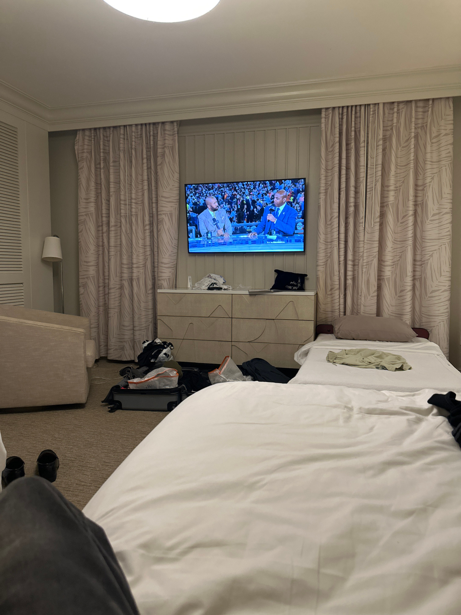A bedroom in Aventura, United States of America, contains a made bed with white linens, positioned in the right side of the frame, covered with scattered clothing. A television mounted on the wall is…read more