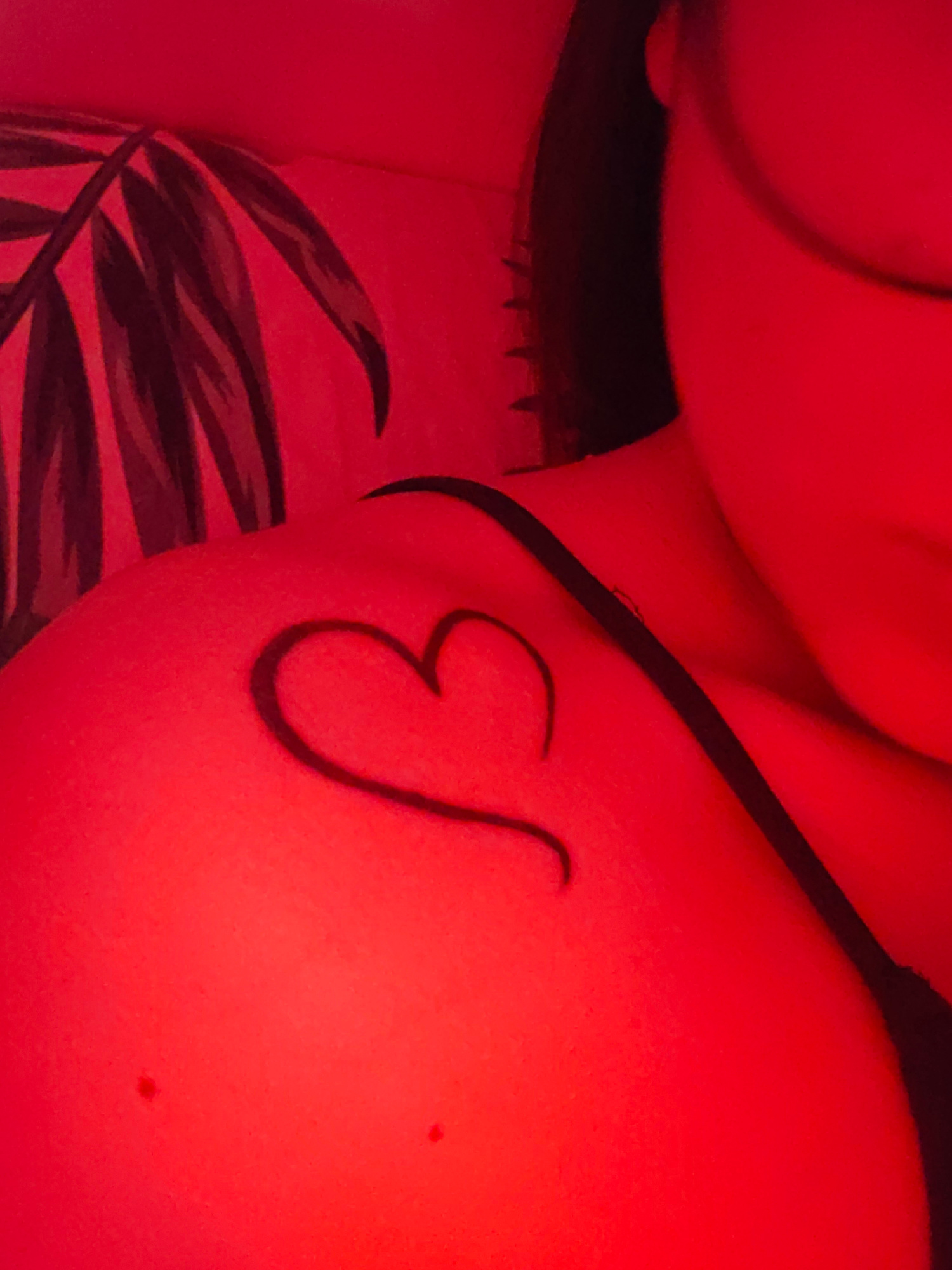 The image, illuminated with red light, appears to be a close-up shot of a person's body. A black thong bikini bottom is visible, along with a tattoo of a stylized heart symbol on the right buttock.…read more