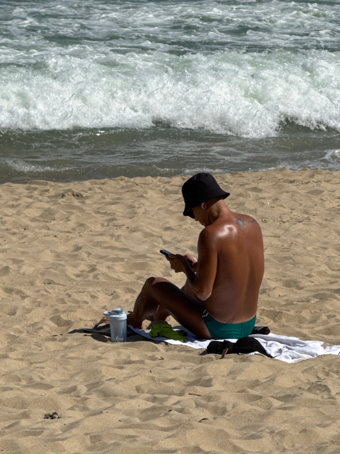 A shirtless person wearing a black bucket hat and green swim trunks stands on a sandy beach near breaking waves. The individual bends over, looking at a cell phone in their hand. A white and green tow…read more