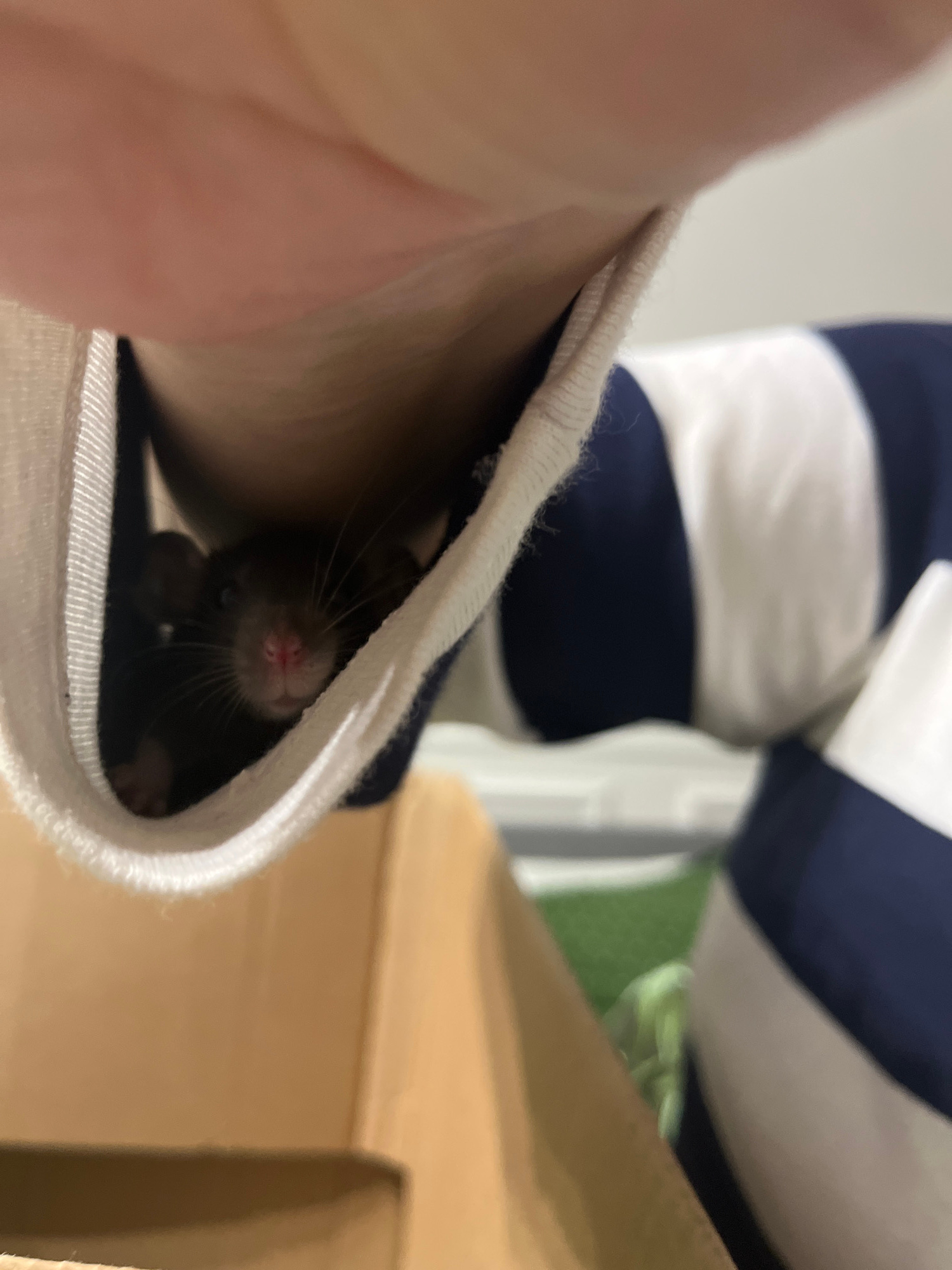 A close-up shot shows a small, dark-furred rodent, possibly a rat or mouse, partially concealed within the sleeve of a garment. The garment has a white and blue striped pattern. The rodent's snout and…read more
