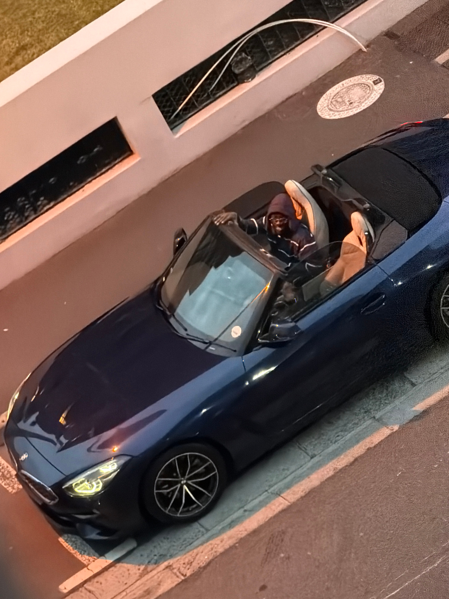 The image shows a dark blue convertible car parked on the side of a street next to a building. A person is sitting in the driver's seat. The building has distinctive decorative window grilles and a ro…read more