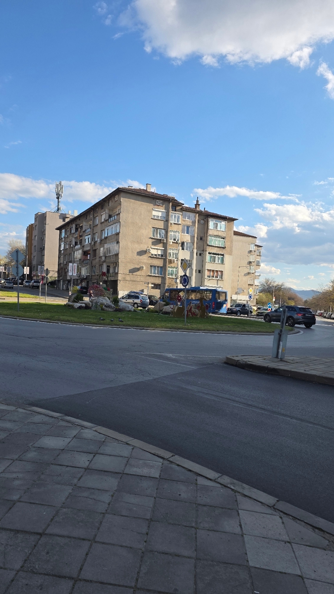 The image depicts a street scene in Blagoevgrad, Bulgaria. A multi-story residential building dominates the left side of the frame, with a blue sky and scattered clouds in the background. The building…read more