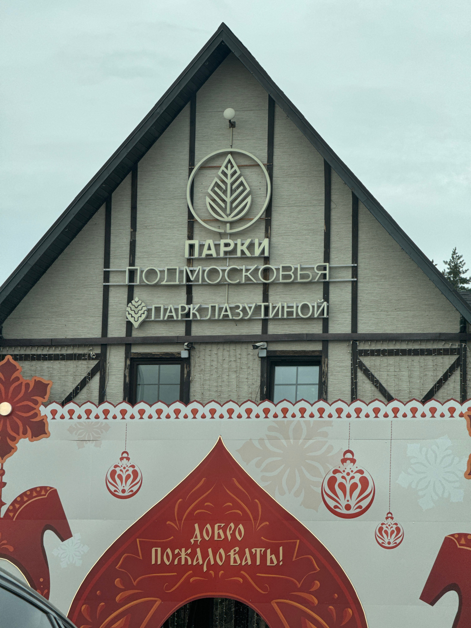 The image depicts the exterior of a building at Lazutina Park (Парк Лазутиной) in Odintsovo, Moscow Oblast, Russia, under an overcast sky. The building features an A-frame gabled facade constructed wi…read more