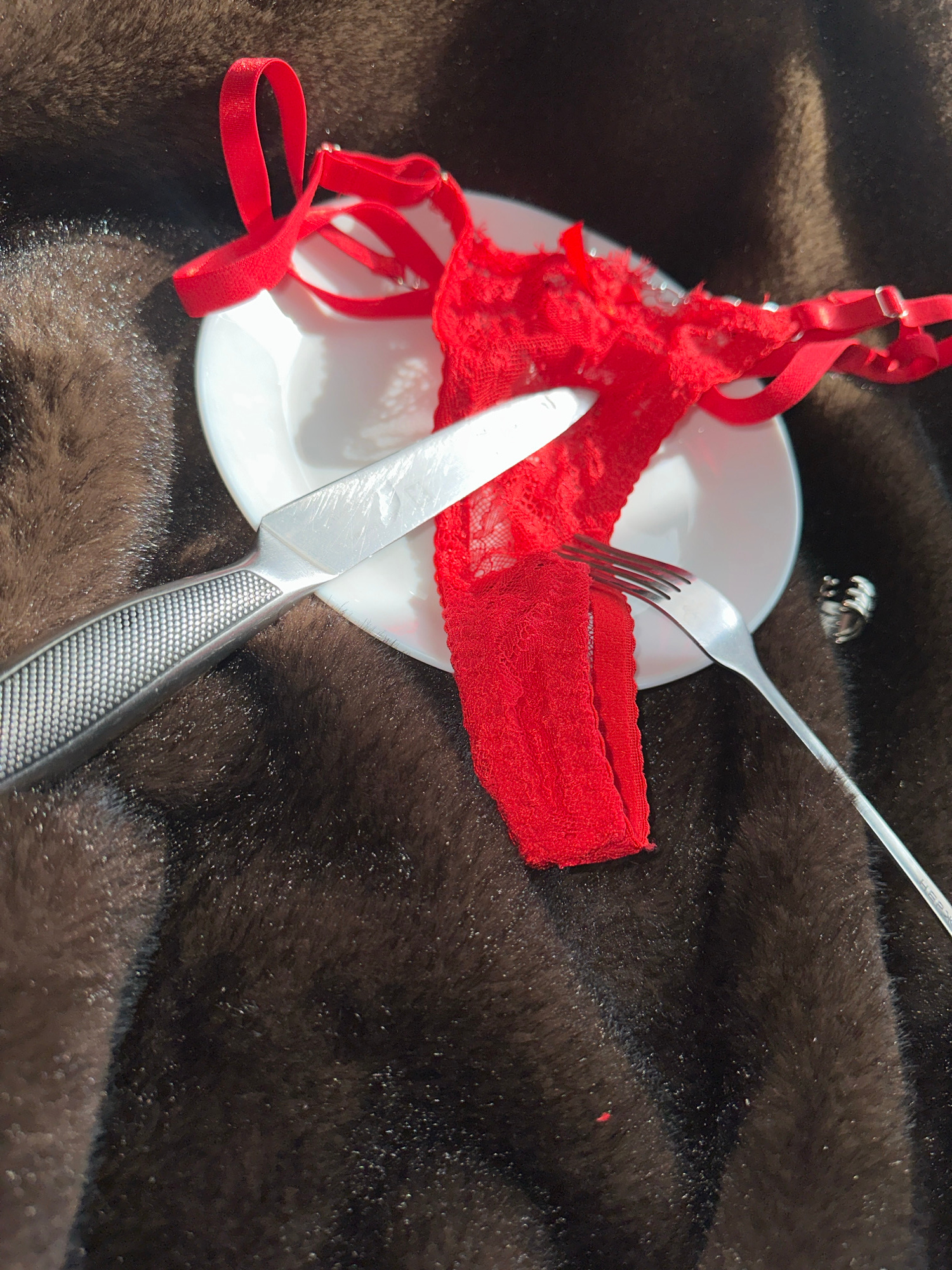 A white plate with a red lace thong, a fork, and a knife is positioned on a dark brown, plush surface that resembles fur or velvet. A ring is visible on the plate to the side of the thong. The photogr…read more