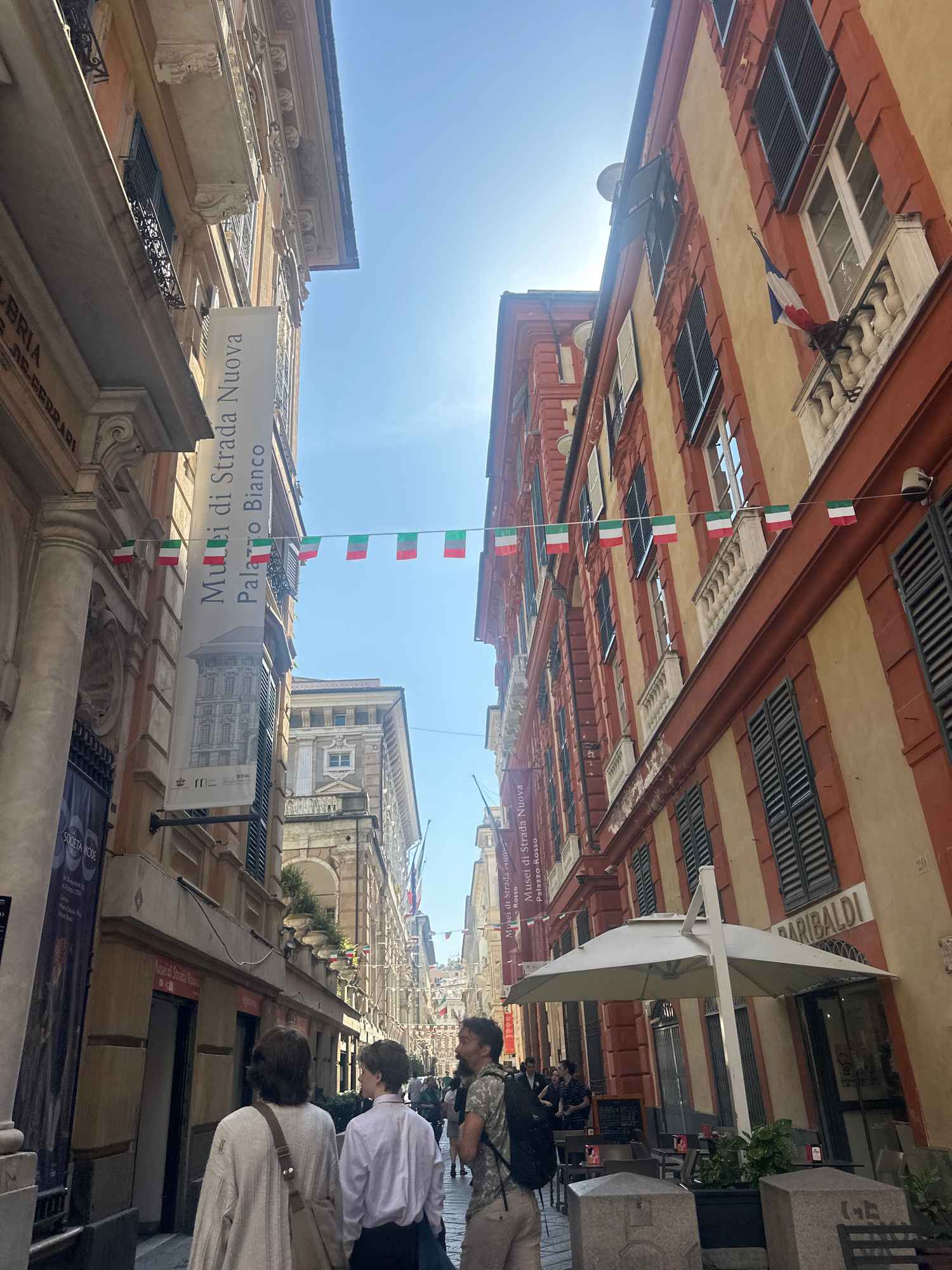 This vibrant, sunny image captures a narrow, historic street in Genoa, Italy, adorned with festive decorations. The street is lined on both sides by tall, ornate buildings featuring traditional Italia…read more