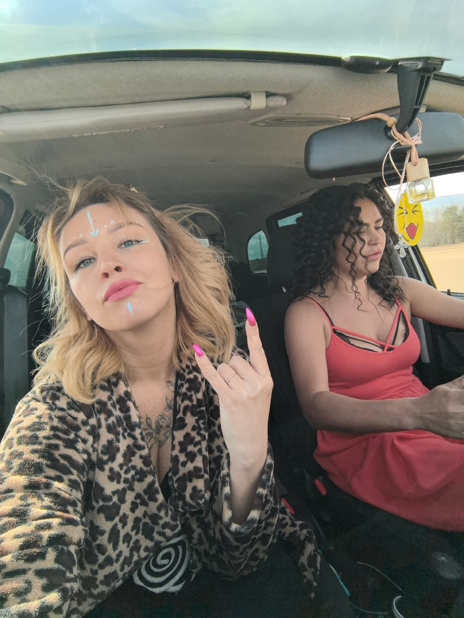 Two women are captured in a selfie taken inside a car during what appears to be daytime with clear, sunny weather, potentially in Chaikovsky, Russia. The woman on the left, who is taking the photo, ha…read more