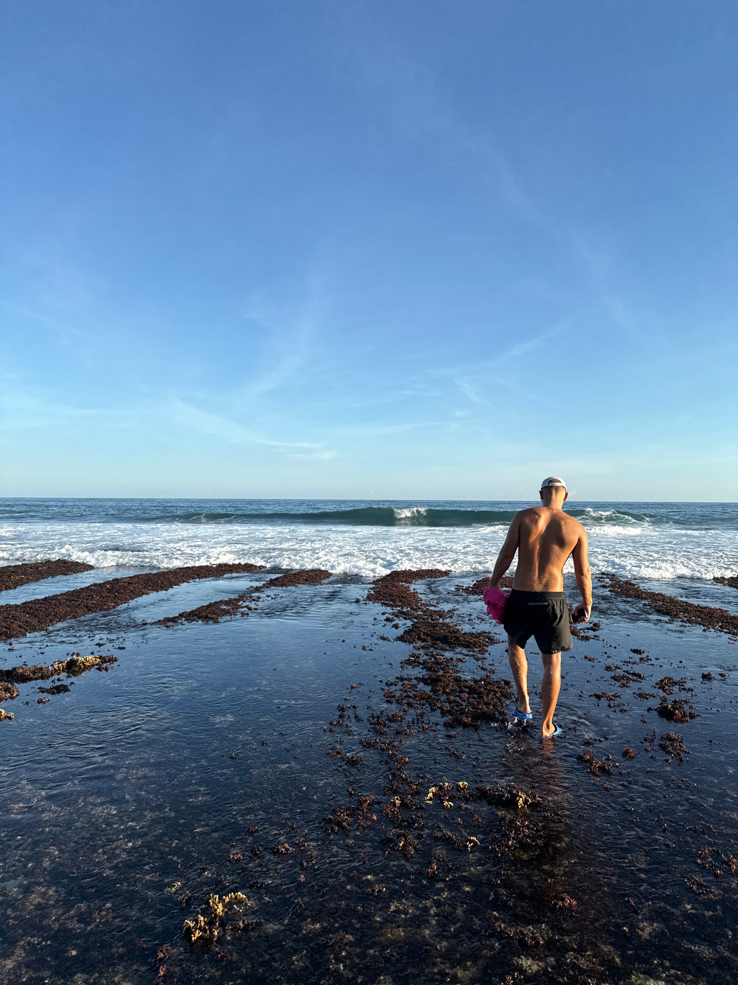 The image displays a man standing on a rocky ocean shore, facing away from the viewer and looking out towards the sea. He is shirtless, wearing dark swim shorts, a light-colored cap, and blue flip-flo…read more