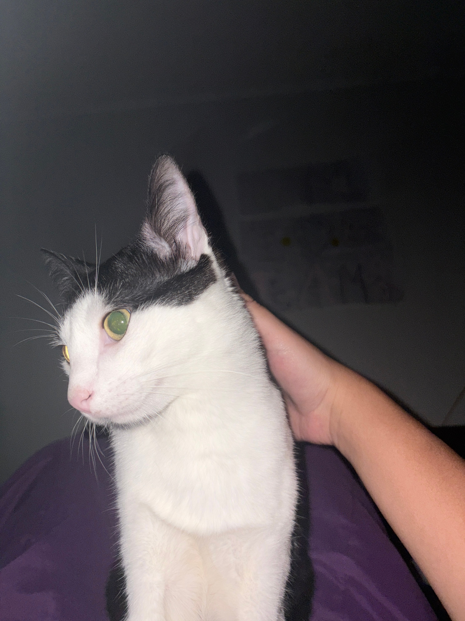 A black and white cat lies on a purple surface under a person's arm. The cat has green eyes and is looking at the camera. The scene appears to be indoors. The location in Ciudad Guayana, Venezuela can…read more