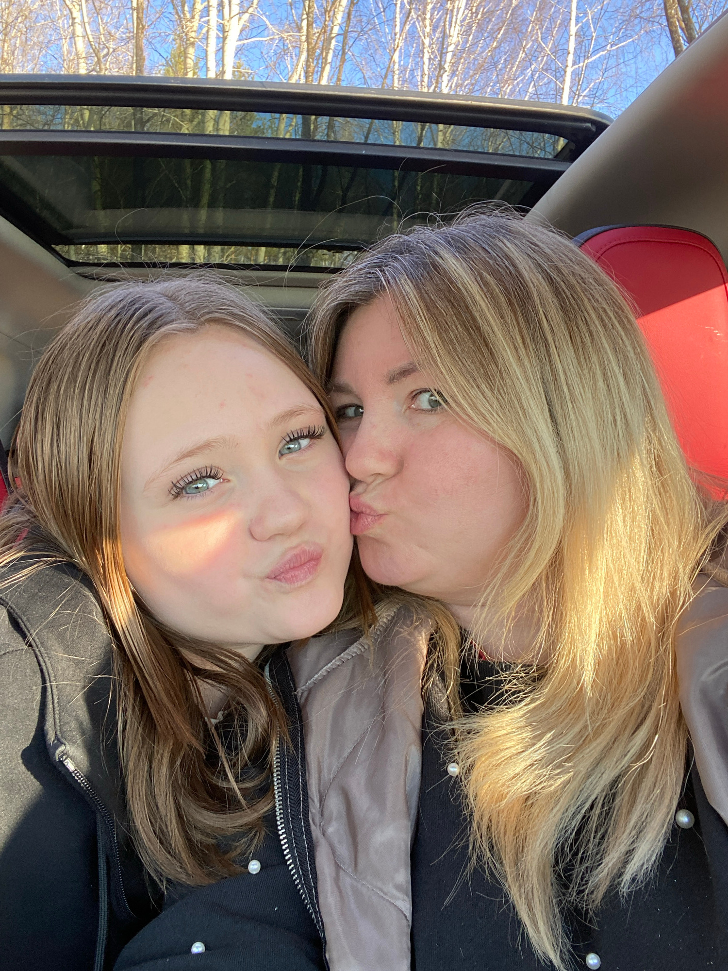 The image captures a close-up, affectionate moment between two females, likely a mother and daughter, taken inside a vehicle. The adult, with long blonde hair, is seen at the top, puckering her lips a…read more