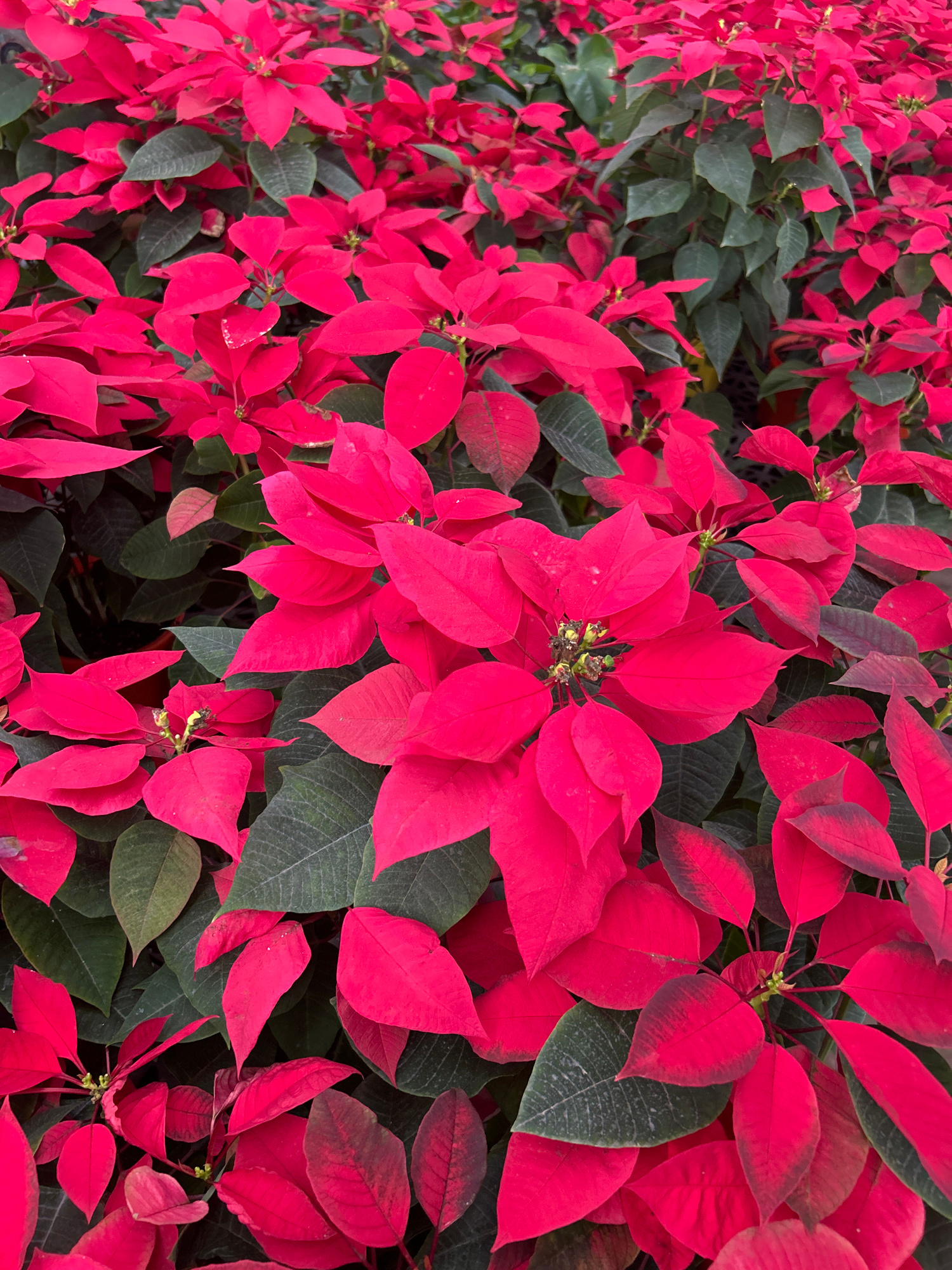 This image provides a vibrant, high-angle close-up view of numerous poinsettia plants (Euphorbia pulcherrima) densely arranged. The scene is dominated by the striking contrast between the brilliant re…read more