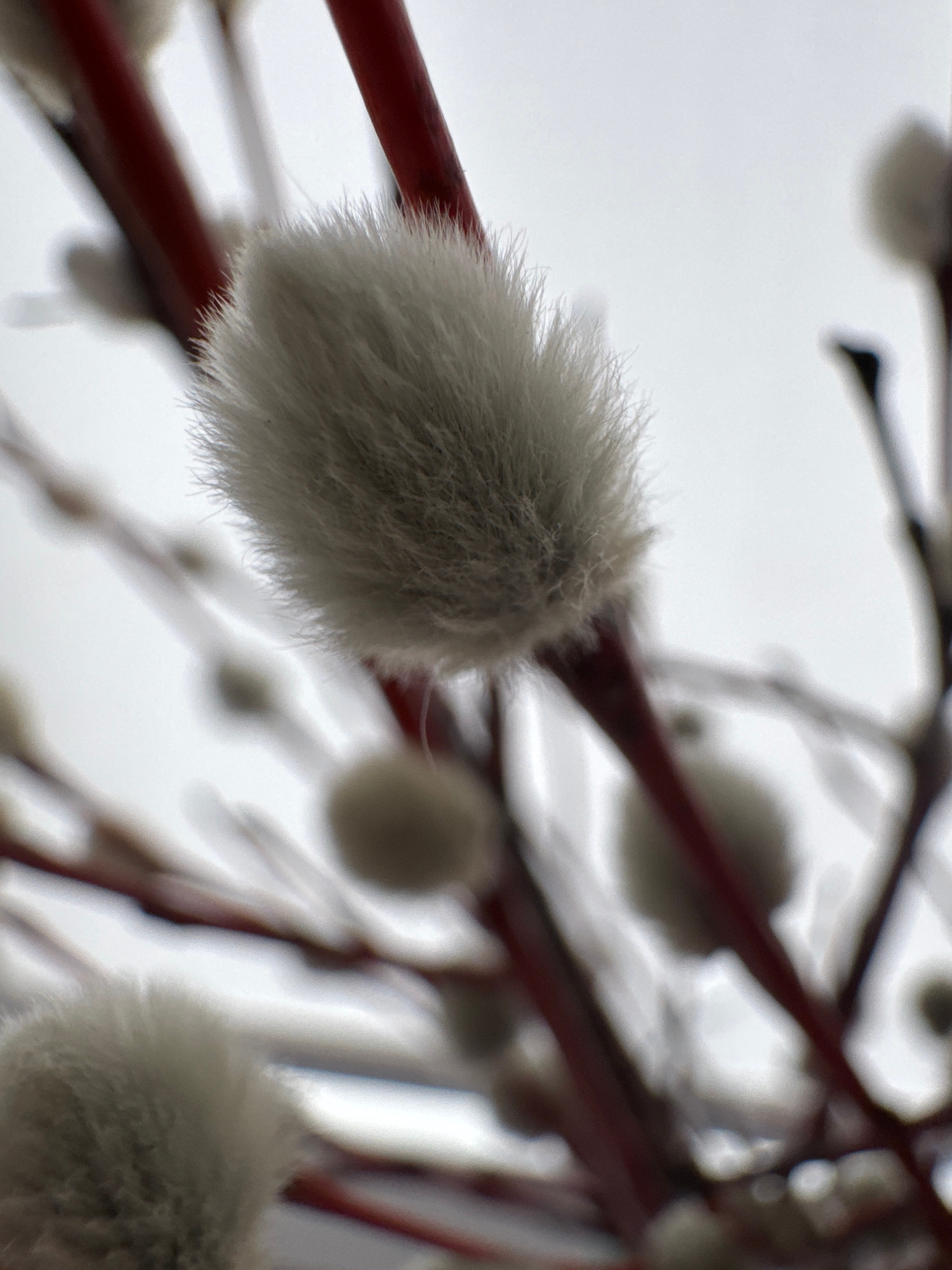 The image depicts a close-up of pussy willow branches against a cloudy sky. The branches are reddish-brown, and the buds are covered in soft, fuzzy, greyish-white hairs. Other than the statement that…read more