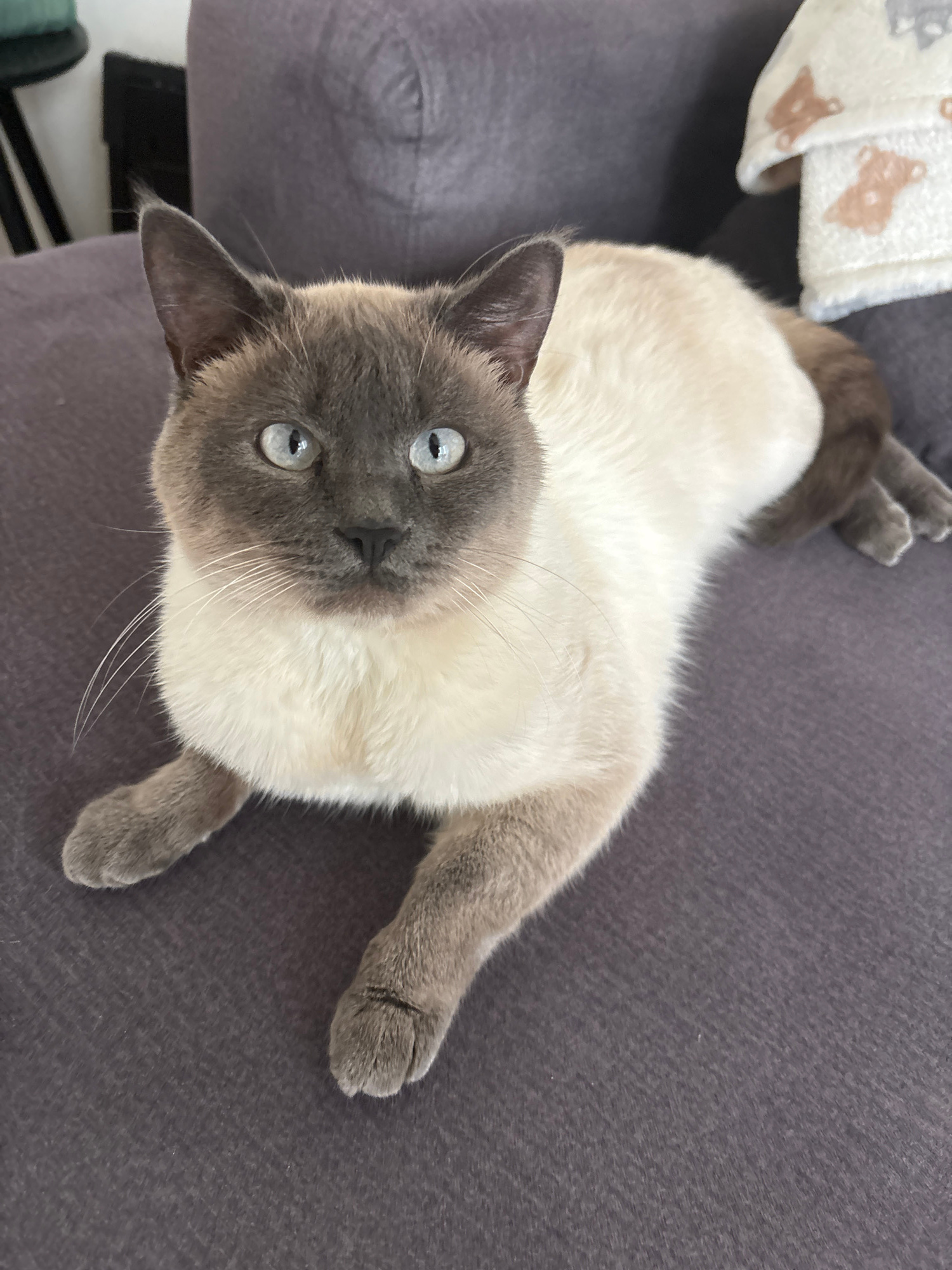 A medium shot of a Siamese cat laying on a grey couch. The cat is light tan in color with a grey face, ears, and extremities. The cat is looking up at the camera with blue eyes. To the left of the cat…read more