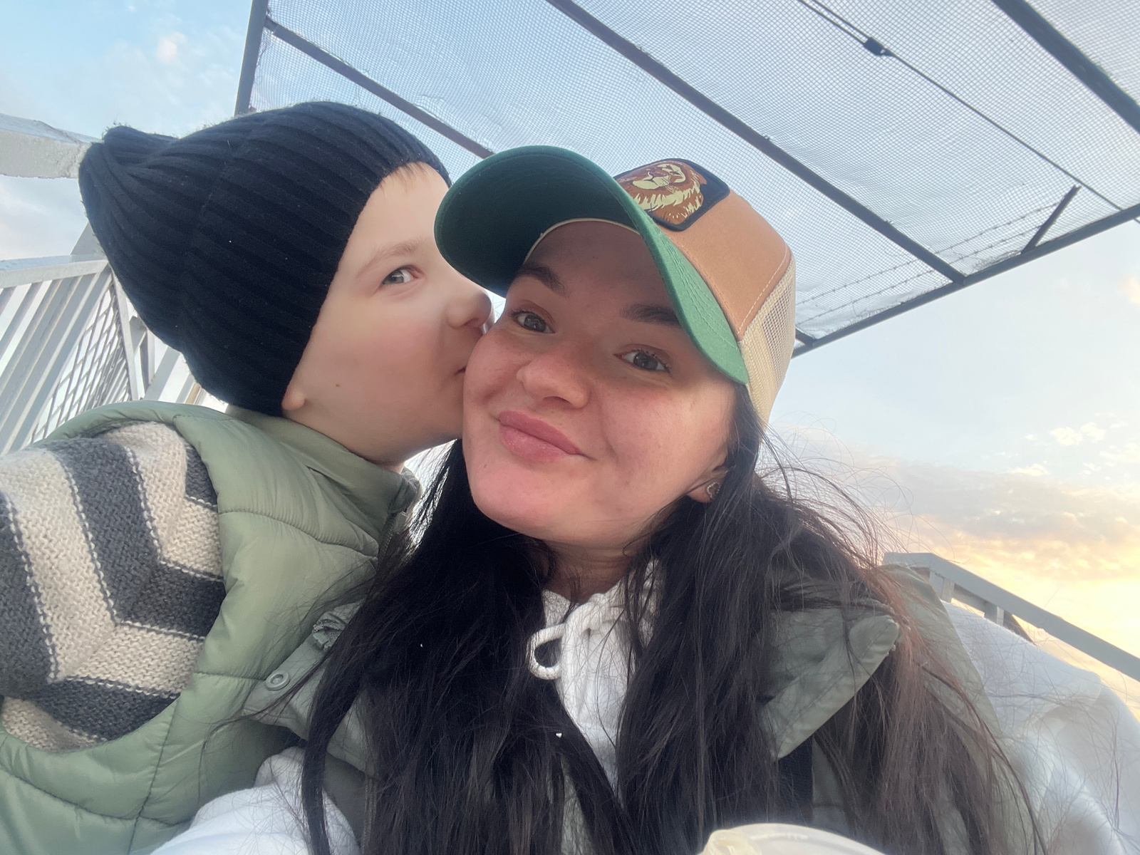 A selfie-style, slightly upside-down photo captures a woman and child. The woman, wearing a green and tan baseball cap with a patch on the front, looks directly at the camera. A child in a black knit…read more