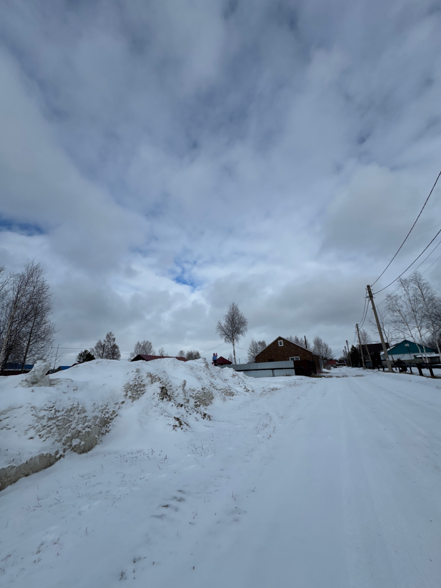 The image shows a winter scene in Высокий, Russia. Snow covers the ground, obscuring the edges of a road. Several small buildings are present on the right, including at least one house constructed of…read more