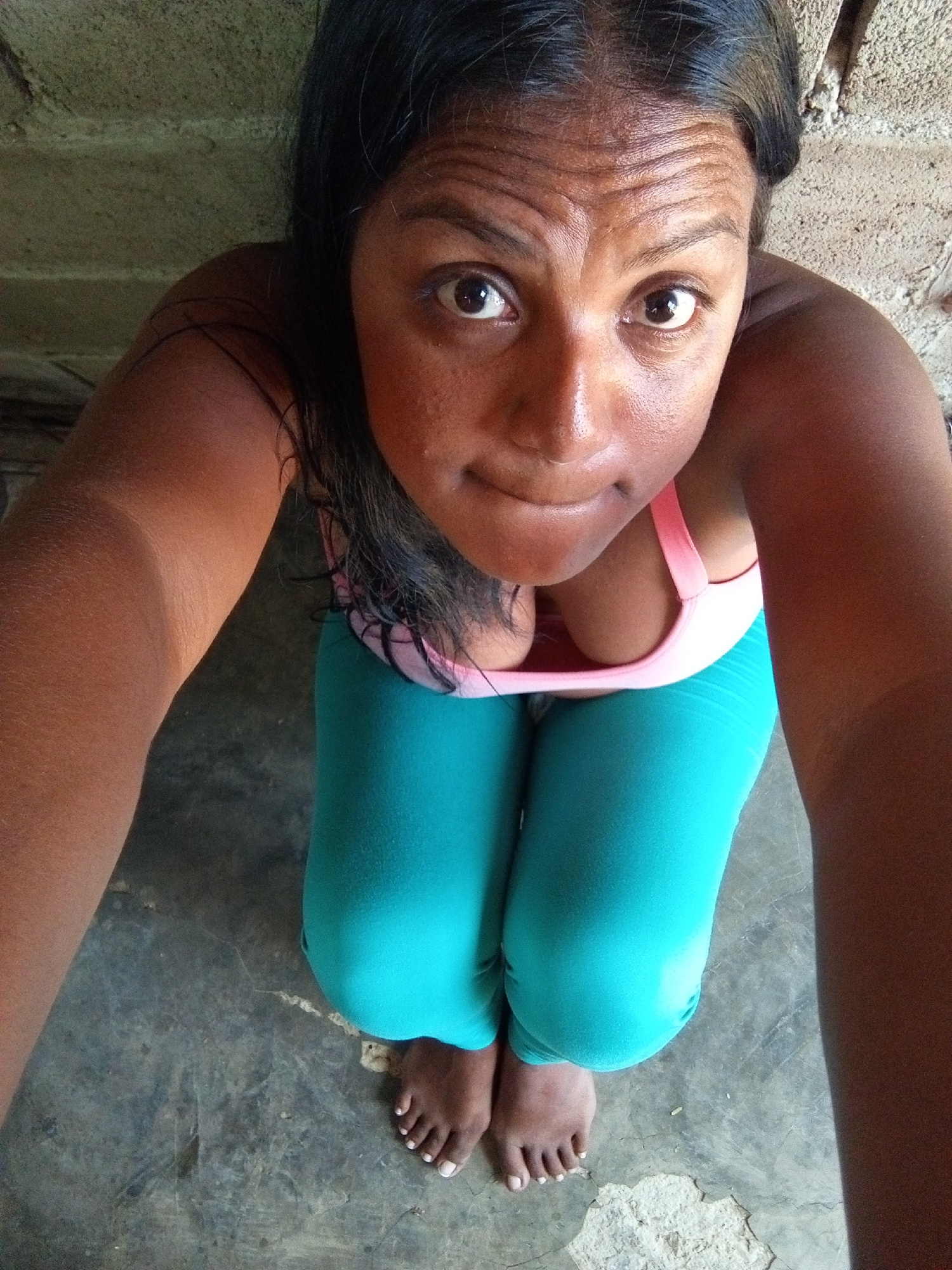 A high-angle, full shot depicts a woman kneeling on a grey, possibly concrete, floor. She is wearing a light pink sports bra and teal leggings. Her bare feet are visible at the bottom of the frame. Sh…read more
