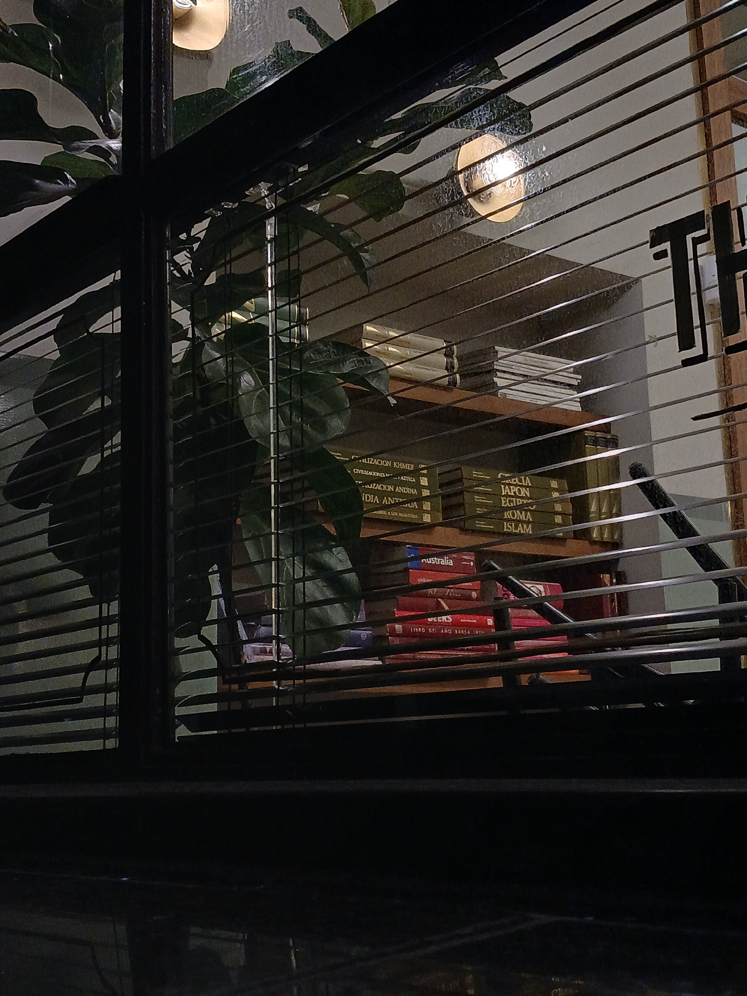 This vertical photograph captures an interior scene, likely a library or study, viewed through a series of dark, slender vertical and diagonal bars, which appear to be part of a window or a decorative…read more