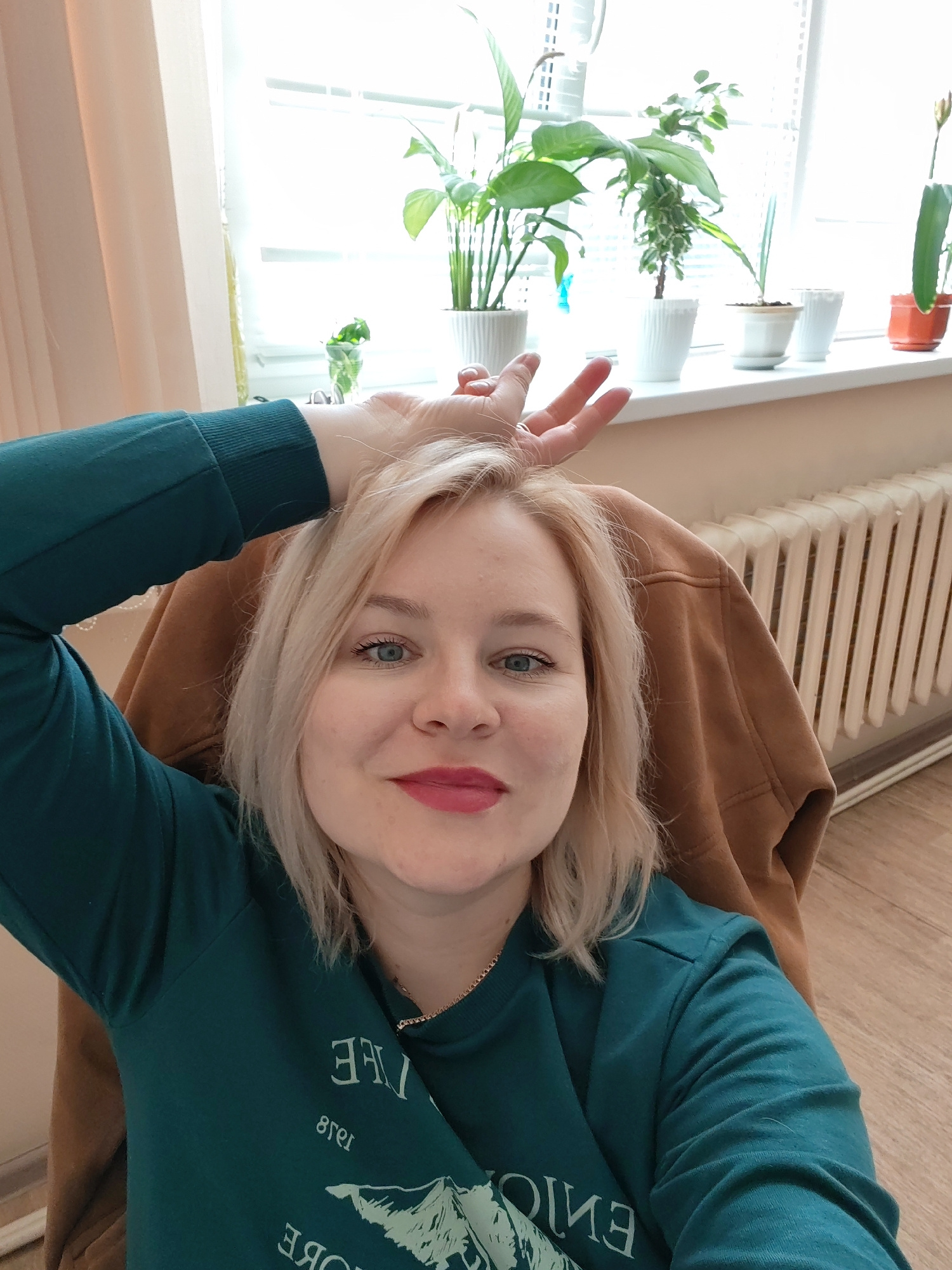 A fair-skinned woman with shoulder-length blonde hair and blue-green eyes is captured in a selfie indoors, likely in Izhevsk, Russia. She is looking directly at the camera with a gentle, pleasant smil…read more