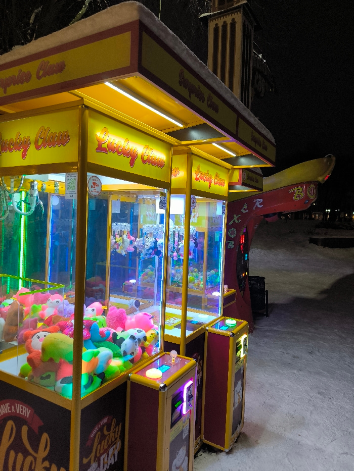 Three "Lucky Claw" crane game machines stand brightly lit on a snowy night. Stuffed animals fill the claw compartments. The structure housing the claw machines is yellow and red. Above the machines, t…read more