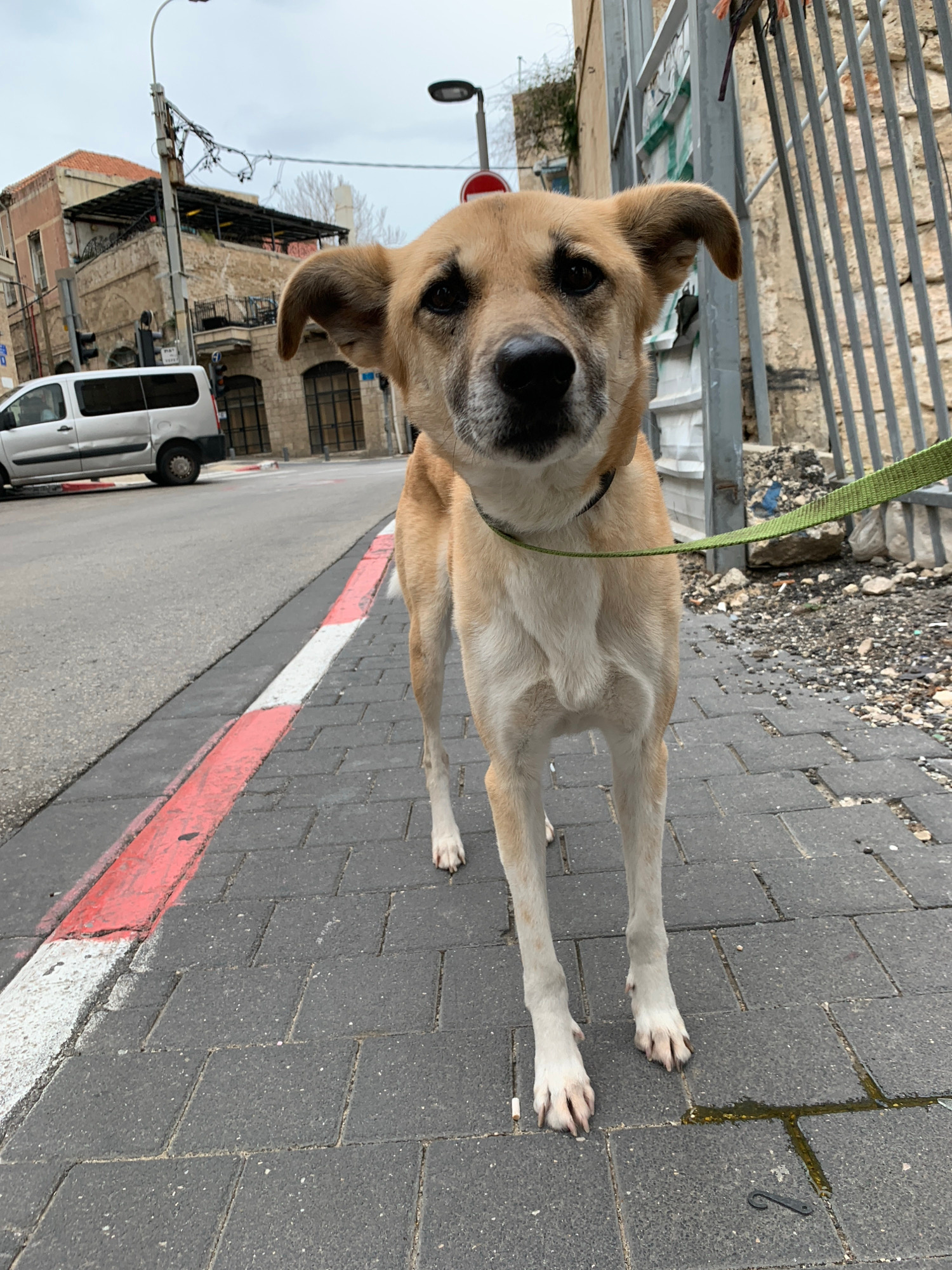 A medium-sized, light-brown dog with white paws is standing on a gray-brick sidewalk. The dog is attached to a green leash and is facing towards the camera. To the left of the dog, there is a curb pai…read more