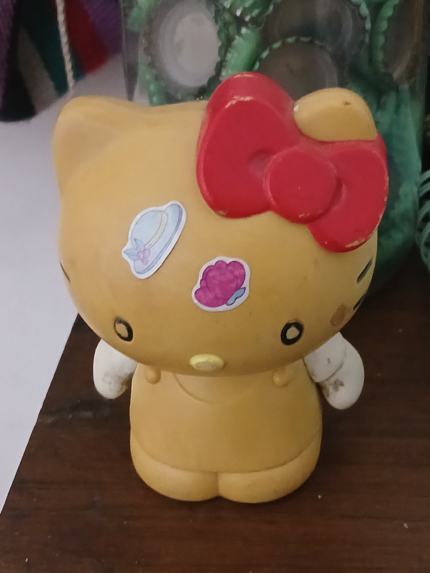 The image captures a yellow, Hello Kitty-shaped object lying on its side, likely a piggy bank or decorative item, in Buenos Aires, Argentina. The object features a prominent, glossy red bow on its hea…read more